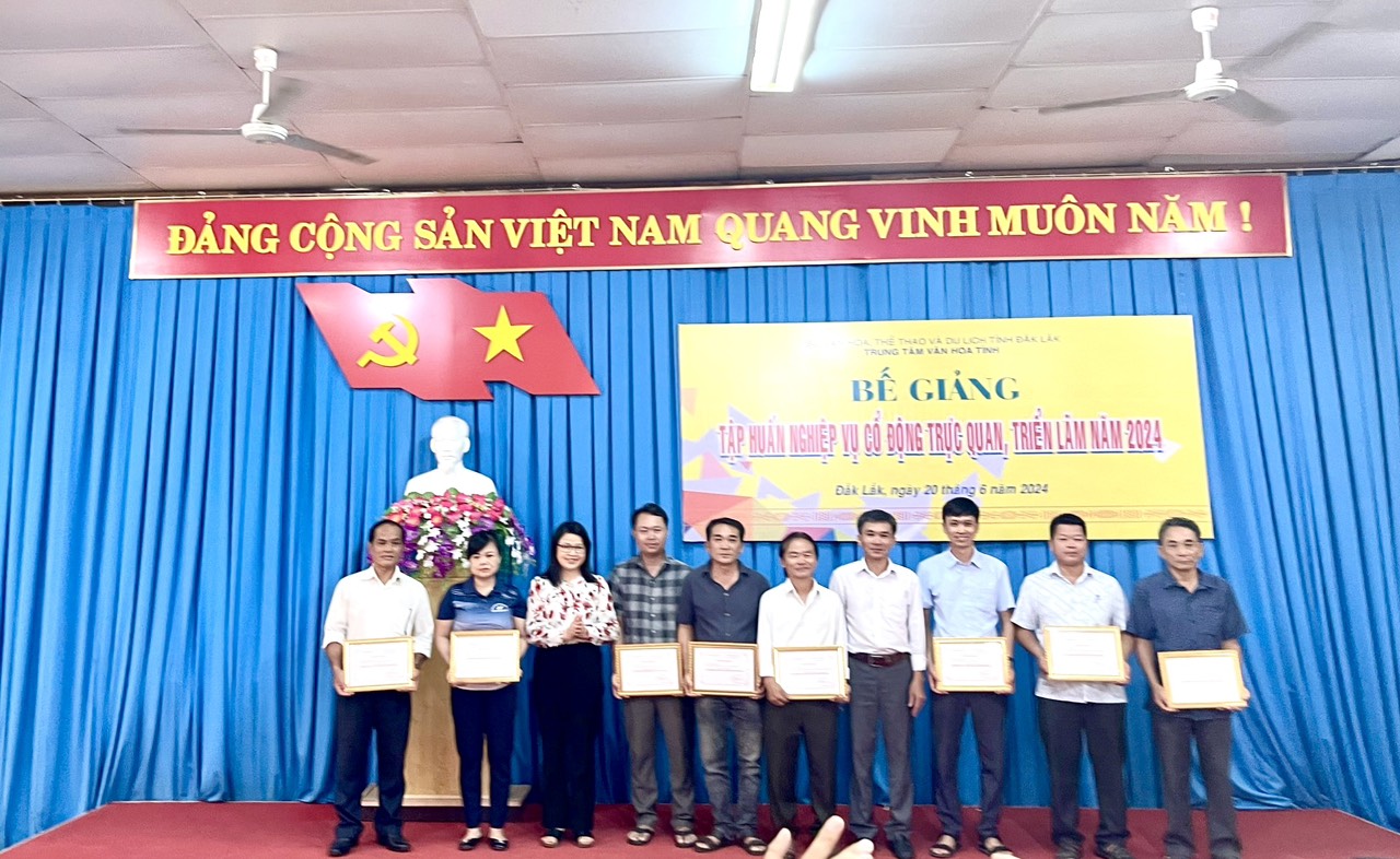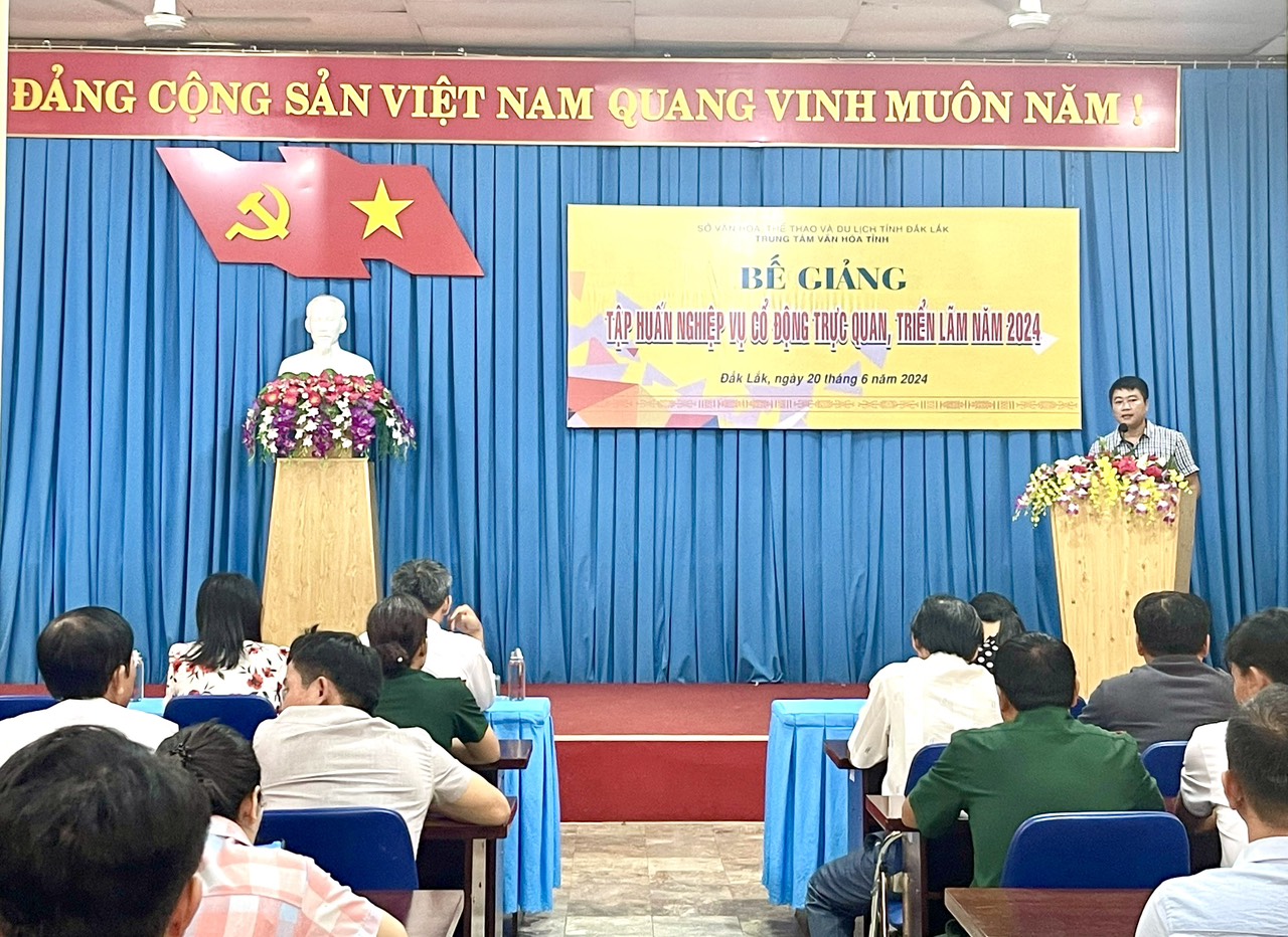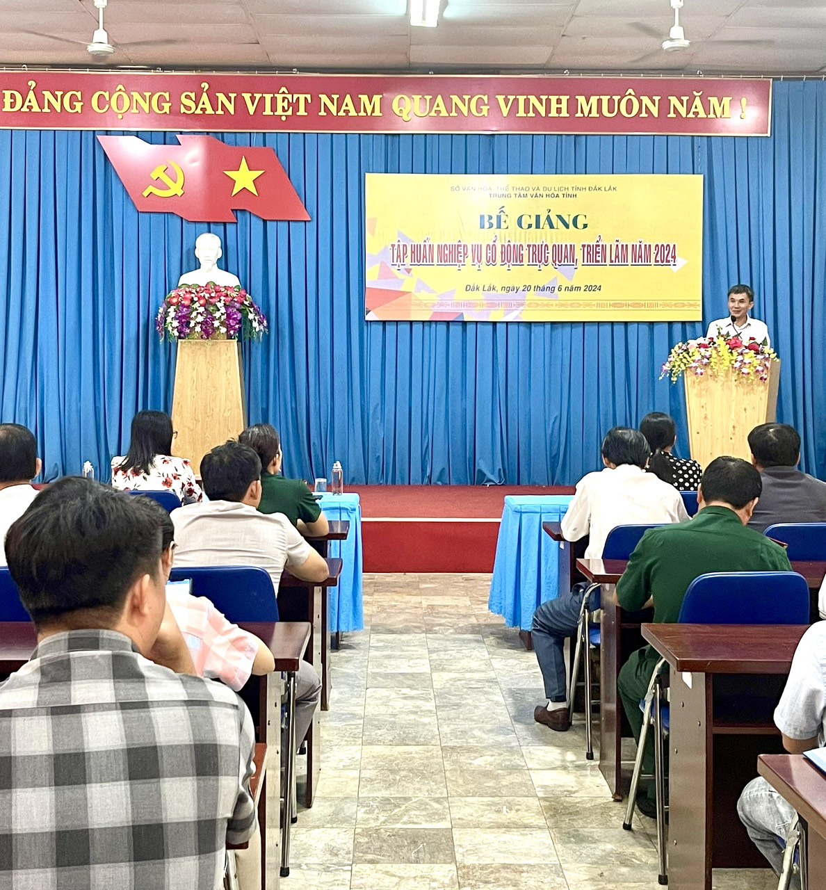 Sáng ngày 20/6/2024, Trung tâm Văn hóa tỉnh tổ chức Bế giảng lớp Tập huấn nghiệp vụ cổ động trực quan, triển lãm năm 2024. Đến tham dự buổi lễ có bà Trương Thị Ánh, Giám đốc Trung tâm Văn hóa tỉnh cùng các ông, bà trong Ban Giám đốc; Lãnh đạo các phòng, đội, viên chức, người lao động của Trung tâm Văn hóa tỉnh và học viên đến từ các huyện, thị xã, thành phố và lực lượng vũ trang trên địa bàn tỉnh.
