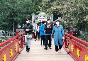 Khách du lịch tại cầu Thê Húc - đền Ngọc Sơn. Ảnh: Thu Hương