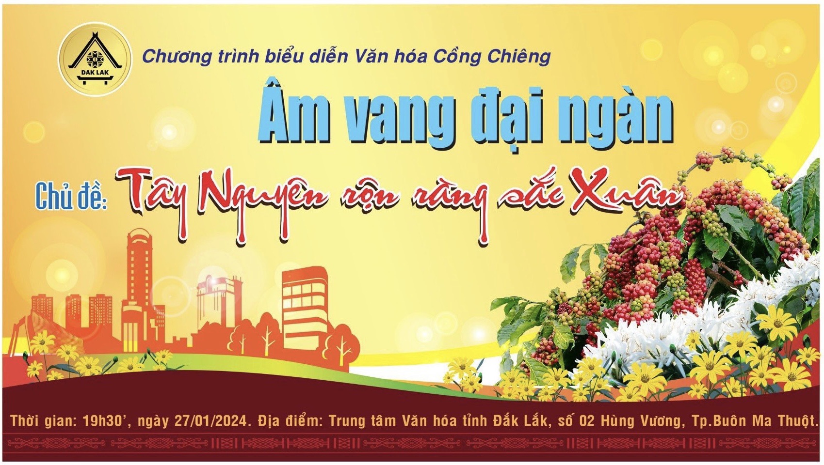 Vào lúc 19h30', ngày 27/01/2024, tại Trung tâm Văn hóa tỉnh Đắk Lắk, Sở Văn hóa, Thể thao và Du lịch tỉnh Đắk Lắk sẽ tổ chức chương trình biểu diễn Văn hóa Cồng chiêng “Âm vang đại ngàn” phục vụ Nhân dân và du khách với chủ đề "Tây Nguyên rộn ràng sắc Xuân", với sự tham gia biểu diễn của Đoàn Ca múa Dân tộc tỉnh và Nhà Lưu trú sắc tộc Têrêxa.