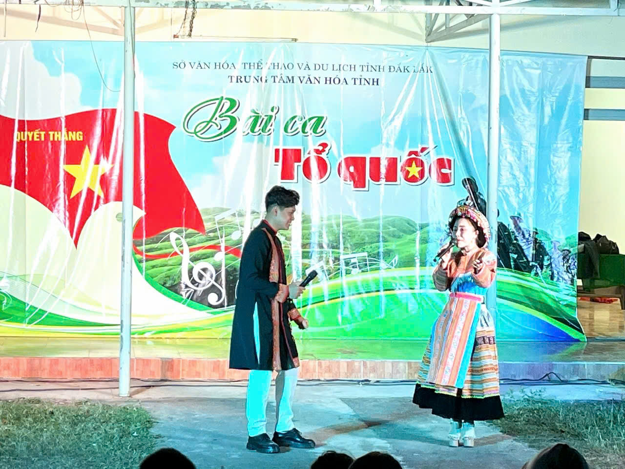 Từ ngày 16/12/2024 đến ngày 20/12/2024, Đội Tuyên truyền Lưu động (Trung tâm Văn hóa tỉnh) biểu diễn Chương trình văn nghệ tổng hợp tuyên truyền phục vụ Nhân dân, với chủ đề “Bài ca Tổ quốc” tại một số xã của các huyện Ea Súp, Buôn Đôn. Đây là hoạt động kỷ niệm 80 năm Ngày thành lập Quân đội nhân dân Việt Nam (22/12/1944 - 22/12/2024) và 35 năm Ngày hội Quốc phòng toàn dân (22/12/1989 - 22/12/2024).