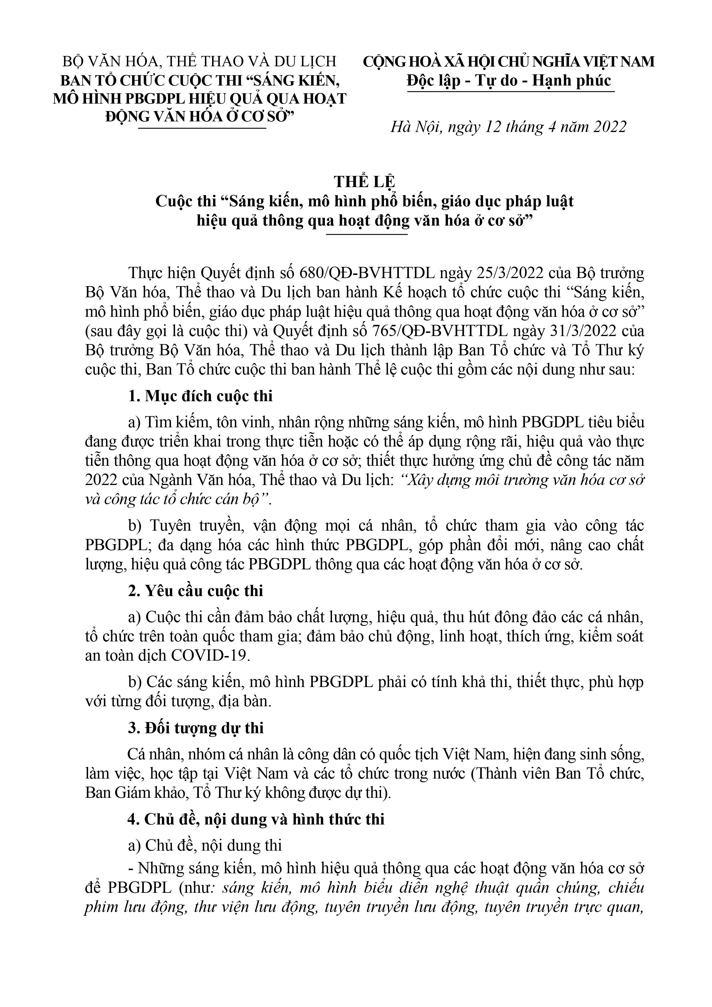 Cuộc thi "Sáng kiến, mô hình phổ biến, giáo dục pháp luật hiệu quả thông qua hoạt động văn hóa ở cơ sở" do Bộ Văn hóa, Thể thao và Du lịch tổ chức từ ngày 14/4 - 30/9/2022 nhằm tìm kiếm, tôn vinh, nhân rộng những sáng kiến, mô hình phổ biến, giáo dục pháp luật tiêu biểu đang được triển khai trong thực tiễn hoặc có thể áp dụng rộng rãi, hiệu quả vào thực tiễn thông qua hoạt động văn hóa ở cơ sở.