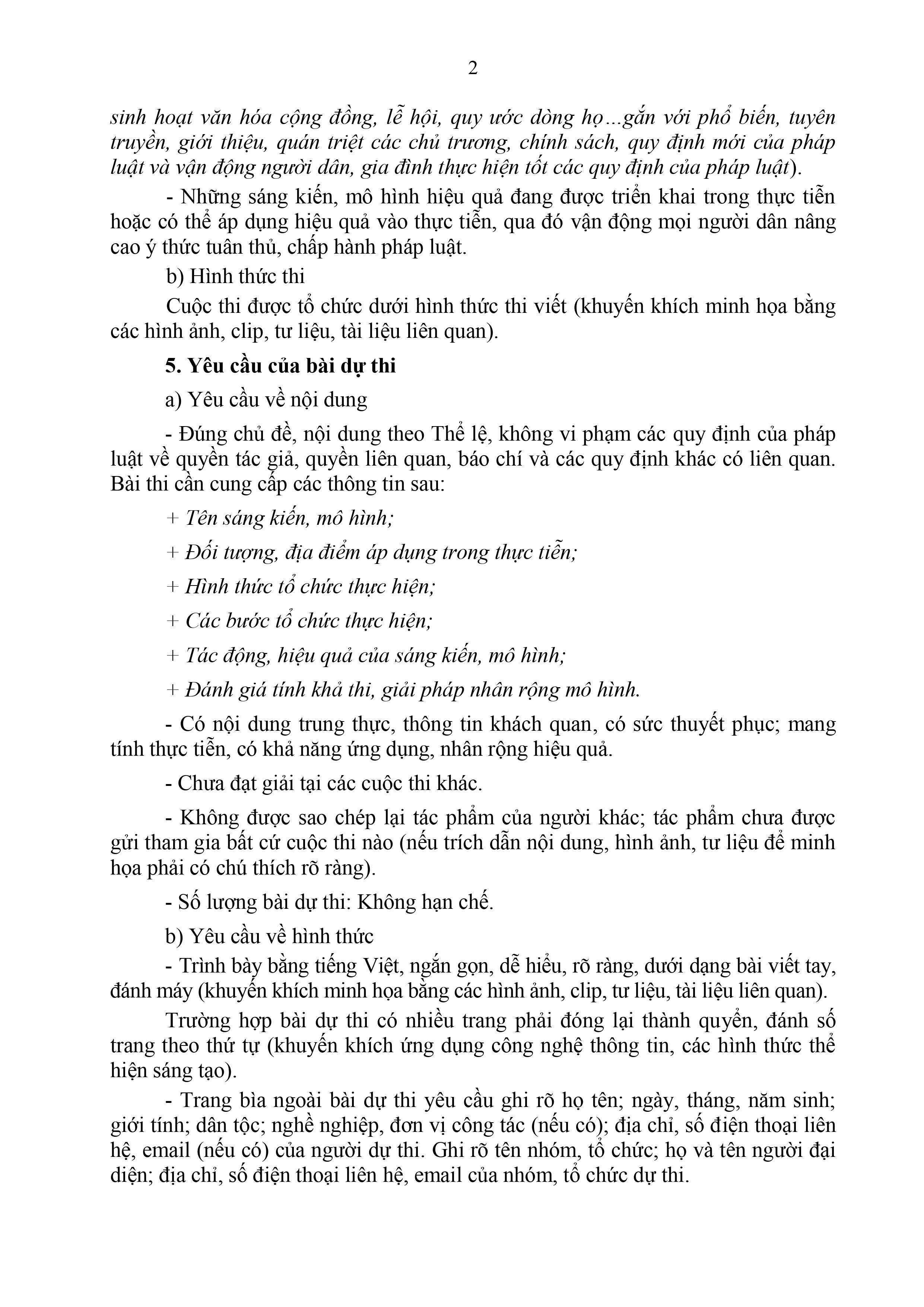 Ban Tổ chức không giới hạn số lượng tác phẩm dự thi. Các tác giả dự thi gửi tác phẩm dưới dạng bài viết, khuyến khích minh họa bằng các hình ảnh, clip, tư liệu, tài liệu liên quan đến những sáng kiến, mô hình hiệu quả thông qua các hoạt động văn hóa cơ sở để phổ biến, giáo dục pháp luật.