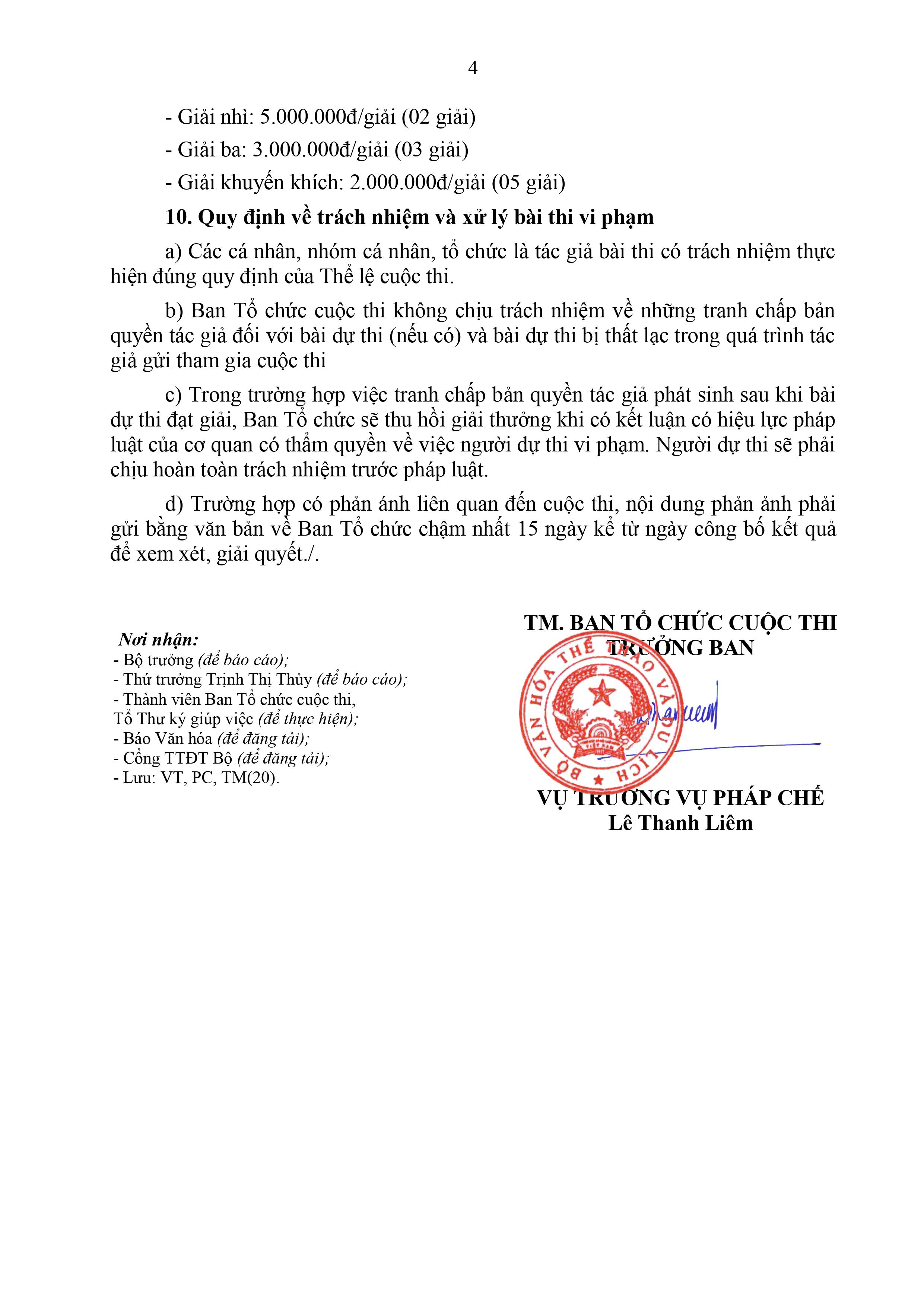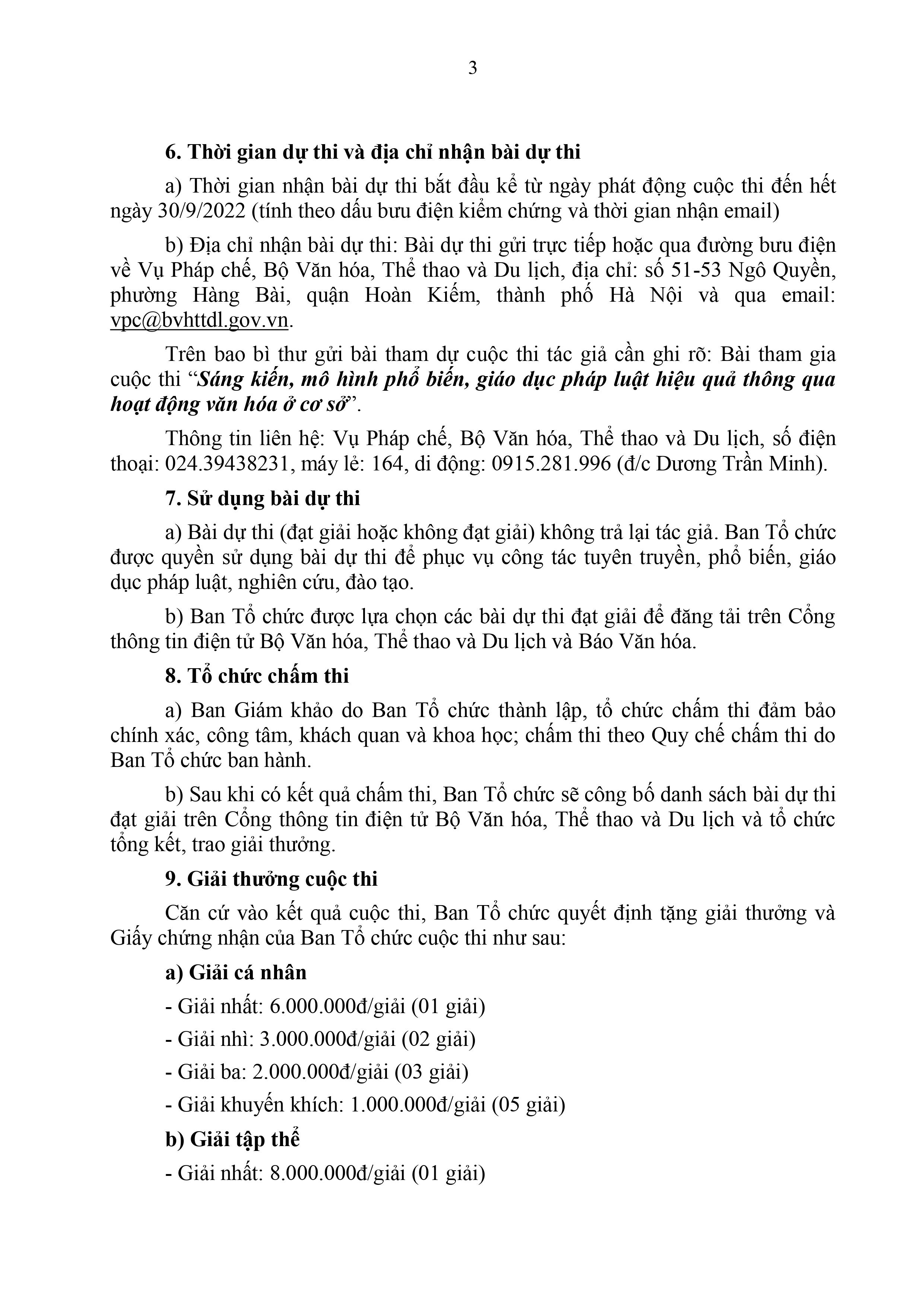 Thời gian nhận bài dự thi từ ngày 14/4 đến hết ngày 30/9/2022 trực tiếp tại Vụ Pháp chế (Bộ VHTTDL, số 51-53 Ngô Quyền, phường Hàng Bài, quận Hoàn Kiếm, TP. Hà Nội) và qua email: vpc@bvhttdl.gov.vn. Lễ tổng kết và công bố các tác phẩm đoạt giải dự kiến sẽ diễn ra ngày 9/11/2022 nhân Ngày Pháp luật Việt Nam năm 2022.