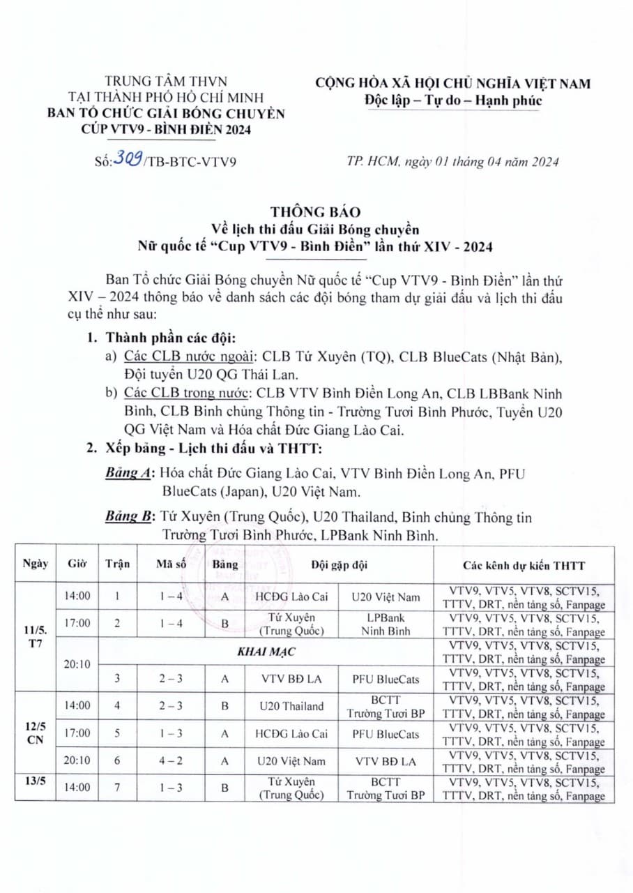 Lịch thi đấu cúp bóng chuyền quốc tế VTV9 Bình Điền