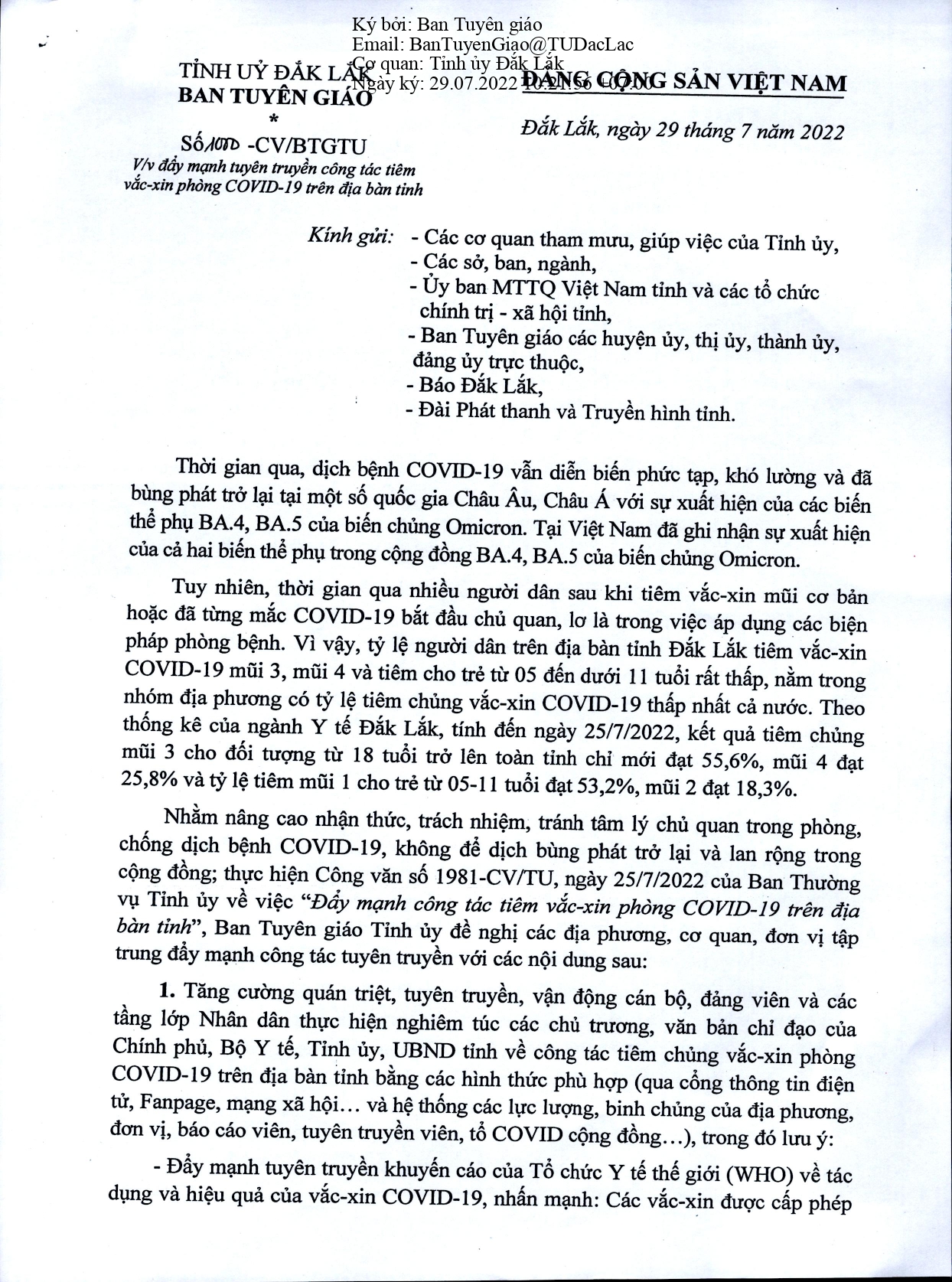 Ban Tuyên giáo Tỉnh ủy vừa ban hành Công văn số 1000-CV/BTGTU về việc đẩy mạnh tuyên truyền công tác tiêm vắc xin phòng COVID-19 trên địa bàn tỉnh.