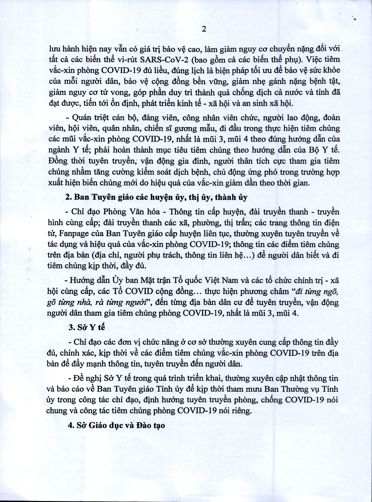 Trong Công văn nhấn mạnh, thời gian qua, dịch bệnh COVID-19 vẫn diễn biến phức tạp, khó lường và đã bùng phát trở lại tại một số quốc gia ở Châu Âu và Châu Á. Tại Việt Nam đã ghi nhận sự xuất hiện của hai biến thể phụ trong cộng đồng BA.4, BA.5 của biến chủng Omicrom. Tuy nhiên, thời gian qua, nhiều người dân khi đã tiêm vắc xin mũi cơ bản hoặc từng mắc COVID-19 bắt đầu chủ quan, lơ là trong việc áp dụng các biện pháp phòng chống bệnh. Vì vậy, tỷ lệ người dân trên địa bàn tỉnh tiêm mũi 3, mũi 4 và tiêm cho trẻ từ 05 đến 11 tuổi rất thấp, nằm trong nhóm tỷ lệ tiêm vắc xin COVID-19 thấp nhất cả nước.