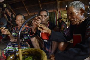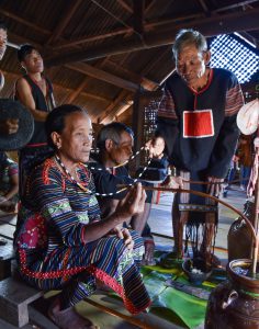 | Thầy cúng Y Tiêng Jie (buôn Jiê Yúk, xã Đắk Phơi, huyện Lắk) thực hiện nghi thức cúng sức khỏe cho vợ chồng chủ nhà. |