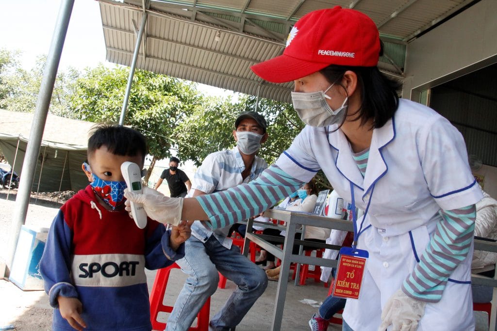 | Cán bộ y tế đo thân nhiệt cho trẻ tại Chốt kiểm soát dịch Cầu 110 (huyện Ea H'leo). |