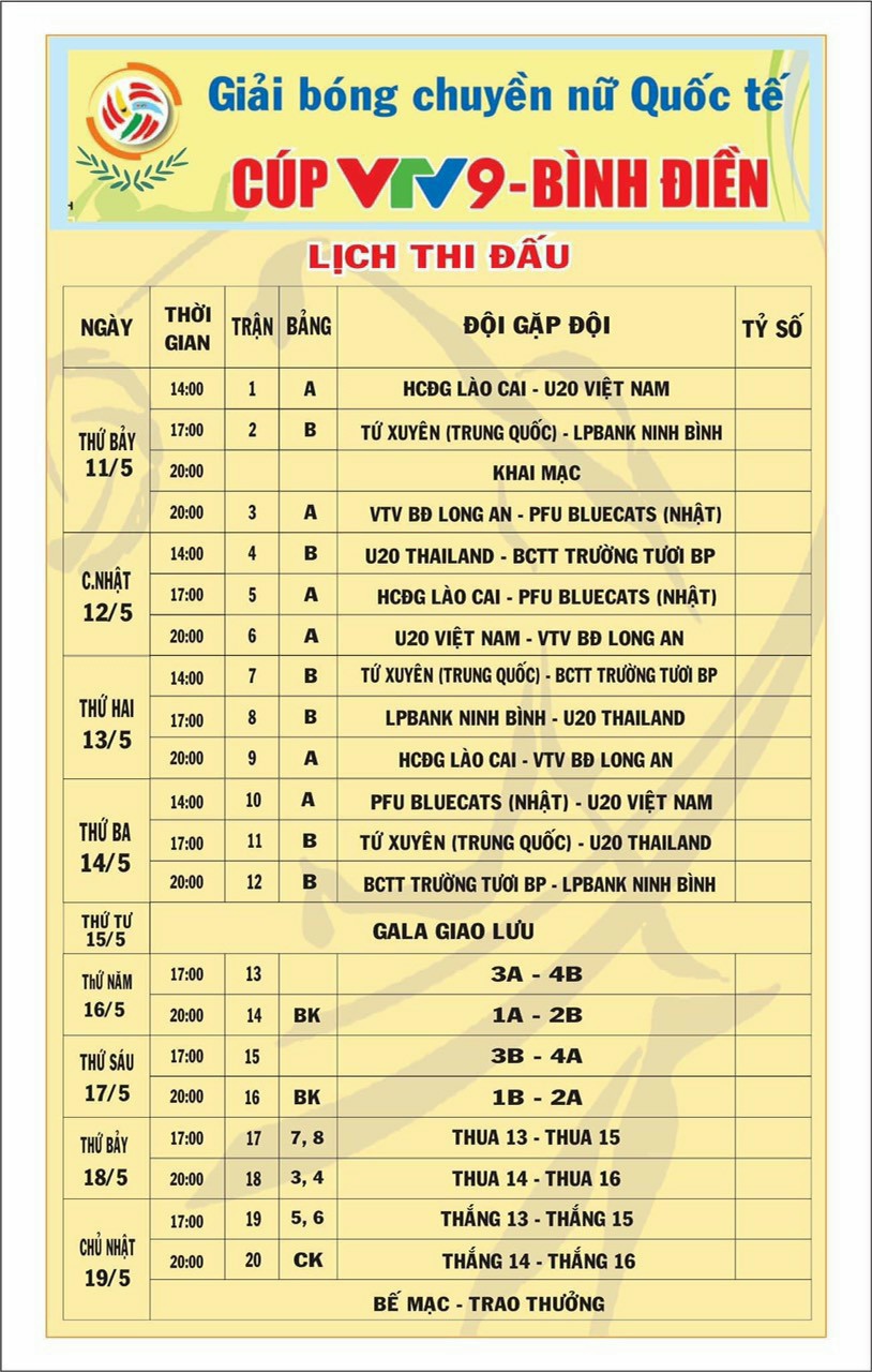 Giải đấu diễn ra từ ngày 11/5-19/5/2024 tại Nhà thi đấu TDTT tỉnh Đắk Lắk (Số 03 Nguyễn Đình Chiểu, Tp.Buôn Ma Thuột) với sự tham gia của 8 đội bóng: VTV Bình Điền Long An, LPBank Ninh Bình, BC Thông tin TTBP, Hoá chất Đức Giang, U20 Việt Nam, U20 Thái Lan, PFU Nhật Bản và Tứ Xuyên - Trung Quốc (đương kim Vô địch cúp VTV9 Bình Điền lần thứ 13-2019).