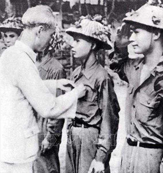 Chủ tịch Hồ Chí Minh thưởng huy hiệu cho các chiến sĩ lập nhiều chiến công trong chiến dịch Điện Biên Phủ. Ảnh tư liệu/TTXVN