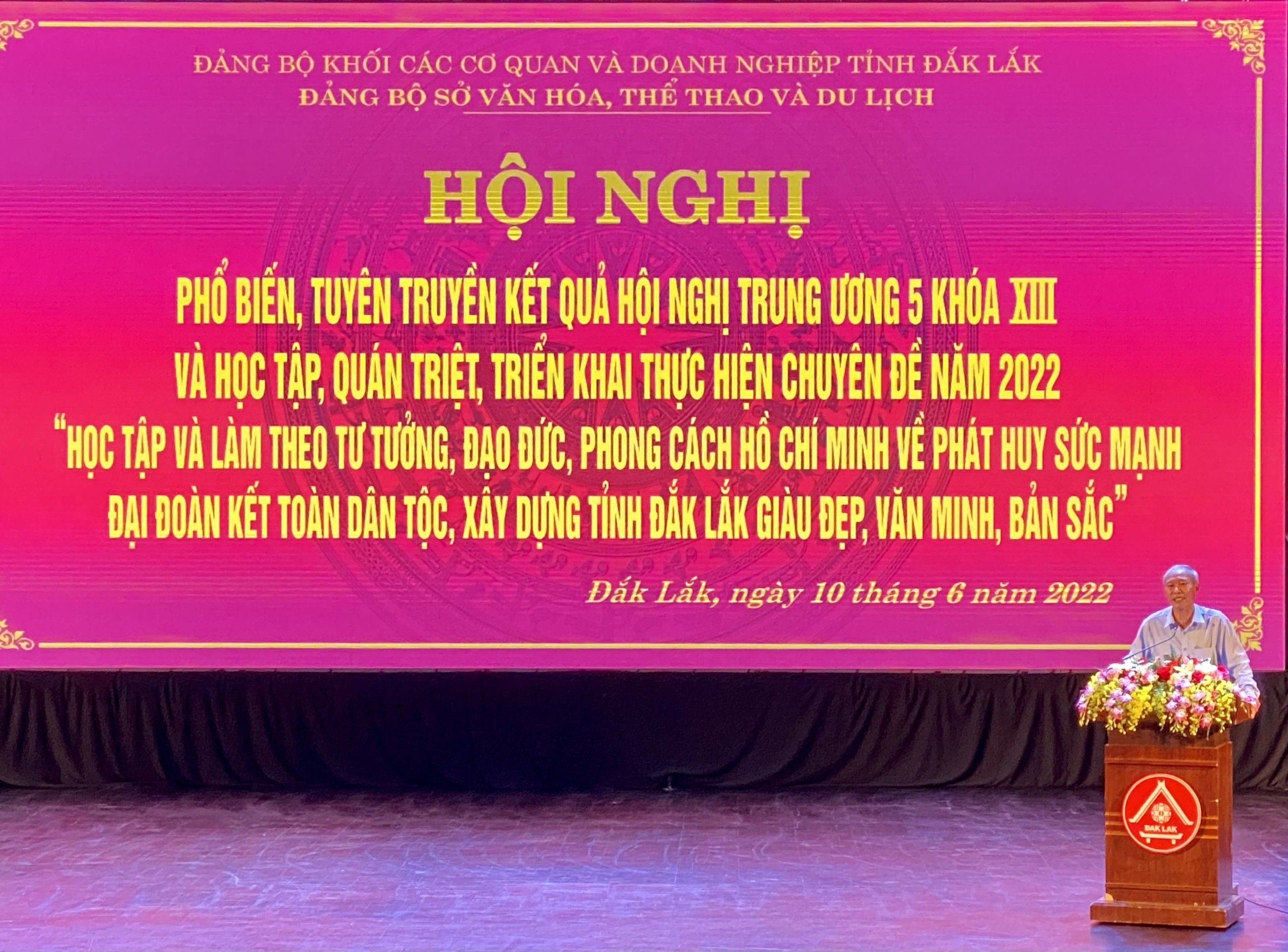 Sáng ngày 10/6, Đảng ủy Sở Văn hoá, Thể thao và Du lịch tổ chức Hội nghị phổ biến, tuyên truyền, kết quả Hội nghị Trung ương 5 khoá XIII và học tập, quán triệt, triển khai thực hiện Chuyên đề năm 2022 “Học tập và làm theo tư tưởng, đạo đức, phong cách Hồ Chí Minh về phát huy sức mạnh đại đoàn kết toàn dân tộc, xây dựng tỉnh Đắk Lắk giàu đẹp, văn minh, bản sắc”.