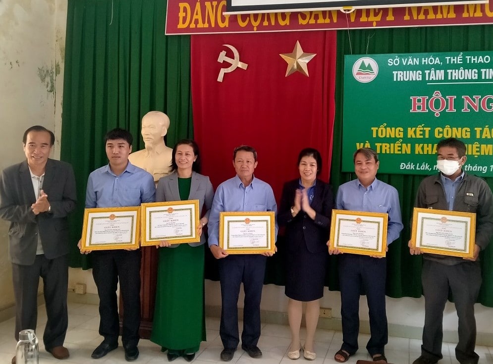 Trong Hội nghị Tổng kết, đại diện Ban giám đốc Trung tâm cũng đề ra các nhiệm vụ trọng tâm năm 2022 như sau: Về công tác Xúc tiến du lịch: Triển khai các chương trình kích cầu, phục hồi hoạt động du lịch tỉnh Đắk Lắk năm 2022; Phối hợp với Hiệp hội du lịch cùng các doanh nghiệp kinh doanh du lịch trên địa bàn tỉnh tổ chức tốt các hoạt động quảng bá, xúc tiến du lịch Đắk Lắk tại các ngày Lễ hội lớn của tỉnh; Tham gia các hội chợ, triển lãm về du lịch trong và ngoài nước trong năm 2022 như: Tham gia Ngày hội Du lịch Tp. Hồ Chí Minh; Hội chợ Du lịch quốc tế - Việt Nam VITM Hanoi; Hội chợ Du lịch Quốc tế ITE – Tp. HCM; Tham gia các hoạt động của Năm Du lịch Quốc gia và các hội chợ khác cùng với các tỉnh đã ký kết liên kết, hợp tác phát triển du lịch giai đoạn 2019 – 2025; Tham gia 01 – 02 hội trợ triển lãm du lịch cùng Tổng cục Du lịch tại các nước trong khối ASEAN (Nhật Bản, Hàn Quốc, Thái Lan, Singapore); Phối hợp với Hiệp hội Du lịch, Hội Doanh nhân trẻ, Hiệp hội Doanh nghiệp tỉnh khảo sát, nghiên cứu và xây dựng các sản phẩm du lịch mới; Mời Đoàn các tỉnh (Hiệp hội Du lịch, các doanh nghiệp) đến Đắk Lắk khảo sát, nghiên cứu và trải nghiệm các sản phẩm, dịch vụ du lịch của tỉnh, đồng thời kết nối với các đơn vị cung ứng dịch vụ du lịch của tỉnh để thu hút khách du lịch đến Đắk Lắk; Tham mưu Ban Giám đốc Sở tổ chức Đoàn đi nghiên cứu thị trường, khảo sát, kết nối du lịch với các tỉnh Nam Trung Bộ, các tỉnh Đồng Bằng Sông Cứu Long và các tỉnh phía Bắc,...; Tham gia các Chương trình Hội nghị, Hội thảo về xúc tiến du lịch trong và ngoài tỉnh; Khảo sát tuyến điểm du lịch mới trong tỉnh; Vận động, khuyến khích các doanh nghiệp kinh doanh dịch vụ du lịch trên địa bàn tỉnh thực hiện các gói kích cầu du lịch: Chương trình khuyến mại, giảm giá sản phẩm, dịch vụ du lịch đi đôi với chất lượng. Tăng cường liên kết, hợp tác với các doanh nghiệp du lịch trong và ngoài tỉnh để nâng cao hiệu quả kích cầu du lịch của tỉnh; Tham gia các lớp tập huấn bồi dưỡng nghiệp vụ xúc tiến du lịch cho cán bộ viên chức Trung tâm do TCDL và Cục công tác Phía Nam - Bộ Văn hóa, Thể thao và Du lịch tổ chức. Về công tác Thông tin Du lịch: Tham gia thực hiện nghiên cứu chuyển đổi số trong du lịch; Thực hiện công tác quảng bá du lịch của tỉnh trên các kênh đài truyền hình địa phương và trung ương. Tiếp tục nâng cấp giao diện, bổ sung thêm một số tích năng mới, tăng cường cập nhật nhiều tin, bài, hình ảnh… để thông tin, quảng bá tiềm năng du lịch của tỉnh đến với đông đảo người dùng trên mạng Internet; Thu thập, tìm kiếm thông tin, bổ sung và làm mới các hình ảnh về các điểm du lịch, danh lam thắng cảnh, di tích lịch sử trên địa bàn tỉnh; Phối hợp tham gia các chương trình xúc tiến du lịch tại các tỉnh, thành trong cả nước. Hướng dẫn, giới thiệu, quảng bá cho các đoàn công tác khảo sát, tham quan du lịch các tỉnh/thành khi đến với tỉnh Đắk Lắk; Thường xuyên cung cấp thông tin về tiềm năng, sản phẩm dịch vụ du lịch của địa phương đến các cơ quan báo trung ương. Nhân dịp này, đại diện ban lãnh đạo của Sở Văn hoá, Thể thao và Du lịch đã công nhận danh hiệu “Tập thể lao động tiên tiến” cho Trung tâm Thông tin Xúc tiến Du lịch Đắk Lắk; trao tặng danh hiệu “Chiến sỹ thi đua cơ sở” cho 3 cá nhân có thành tích xuất sắc, tiêu biểu trong phong trào thi đua năm 2021; Giấy khen cho tập thể Phòng Thông tin Du lịch và Phòng Hành chính - Tổng hợp và Giấy khen cho 5 cá nhân có thành tích xuất sắc trong thực hiện nhiệm vụ công tác năm 2021.
