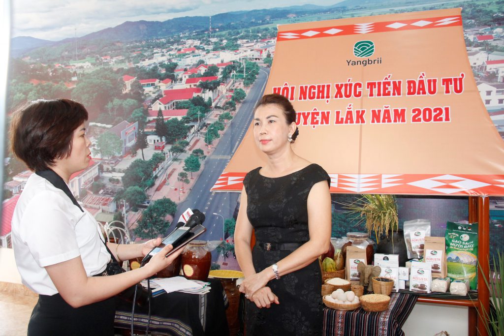 | Bà Bùi Viết Thủy Tiên (bên phải), Giám đốc Công ty TNHH Du lịch đường mòn châu Á trả lời phỏng vấn phóng viên bên lề Hội nghị xúc tiến đầu tư huyện Lắk năm 2021. |