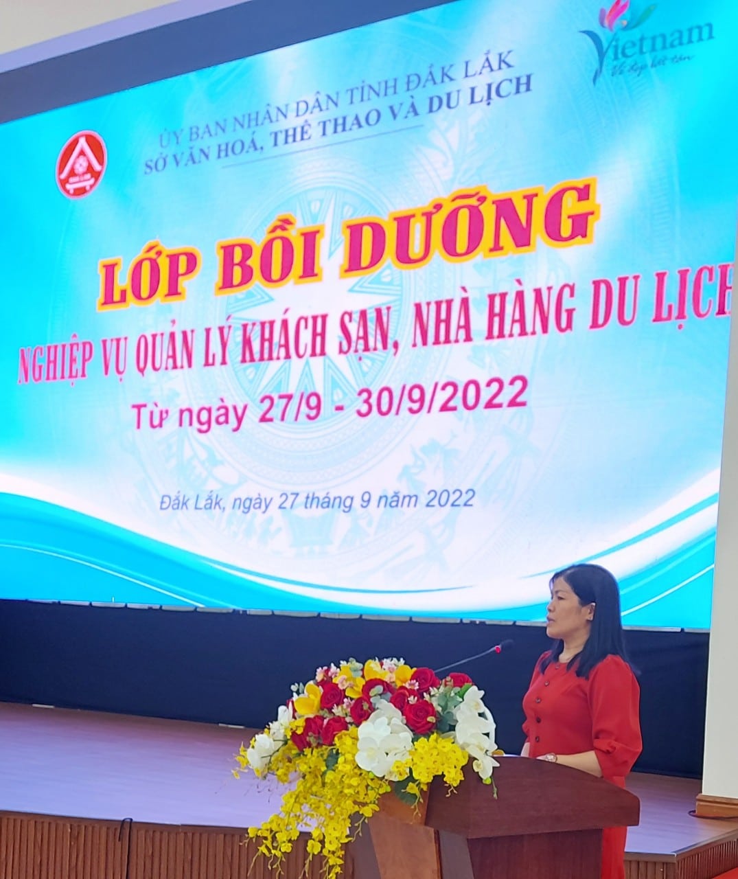 Bà Nguyễn Thụy Phương Hiếu (Phó giám đốc Sở Văn hóa, Thể thao và Du lịch Đắk Lắk) phát biểu khai mạc lớp bồi dưỡng.