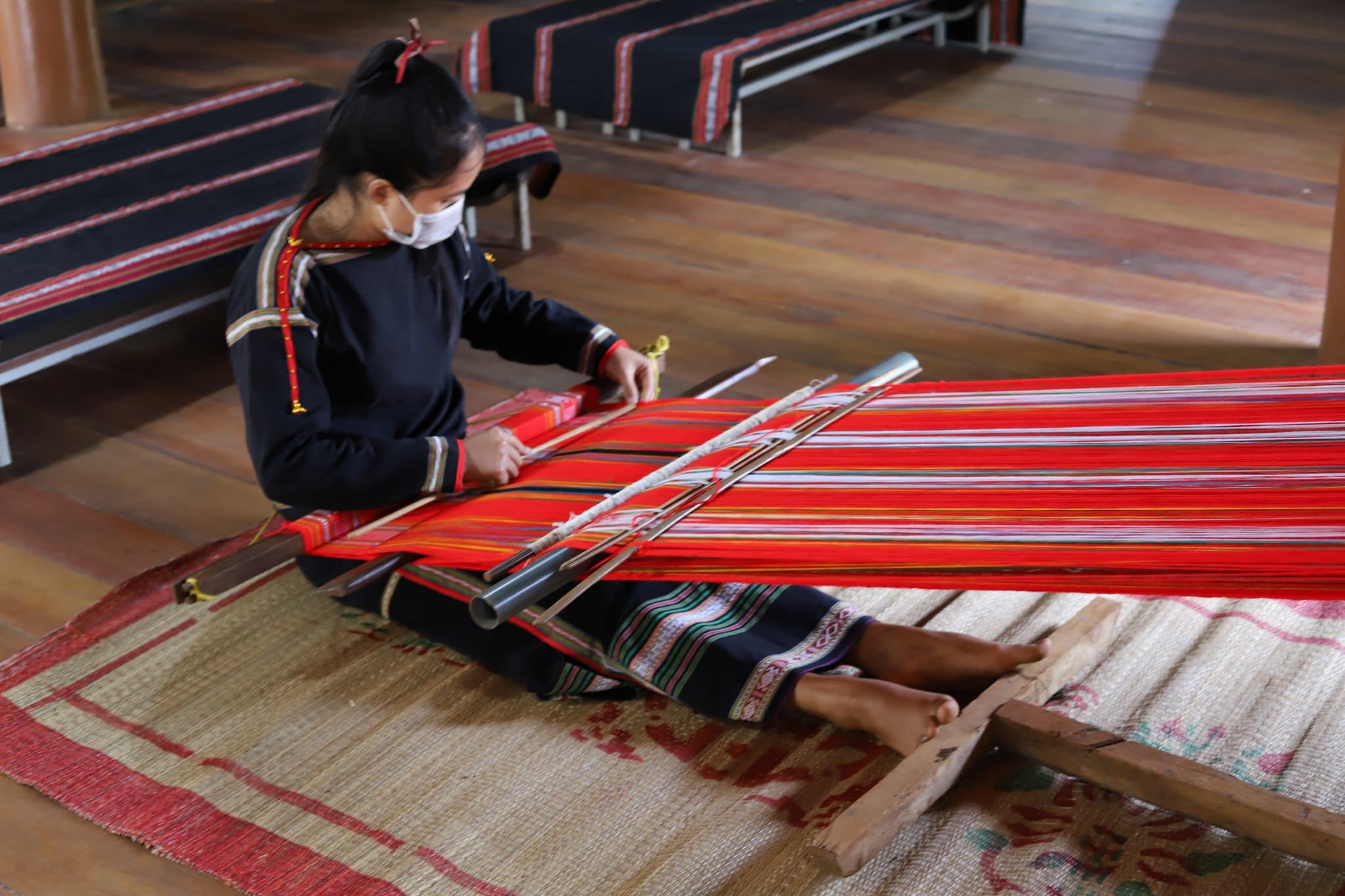 Dệt vải thổ cẩm tại Hợp tác xã dệt thổ cẩm Tơng Bông, Buôn Tơng Ju.