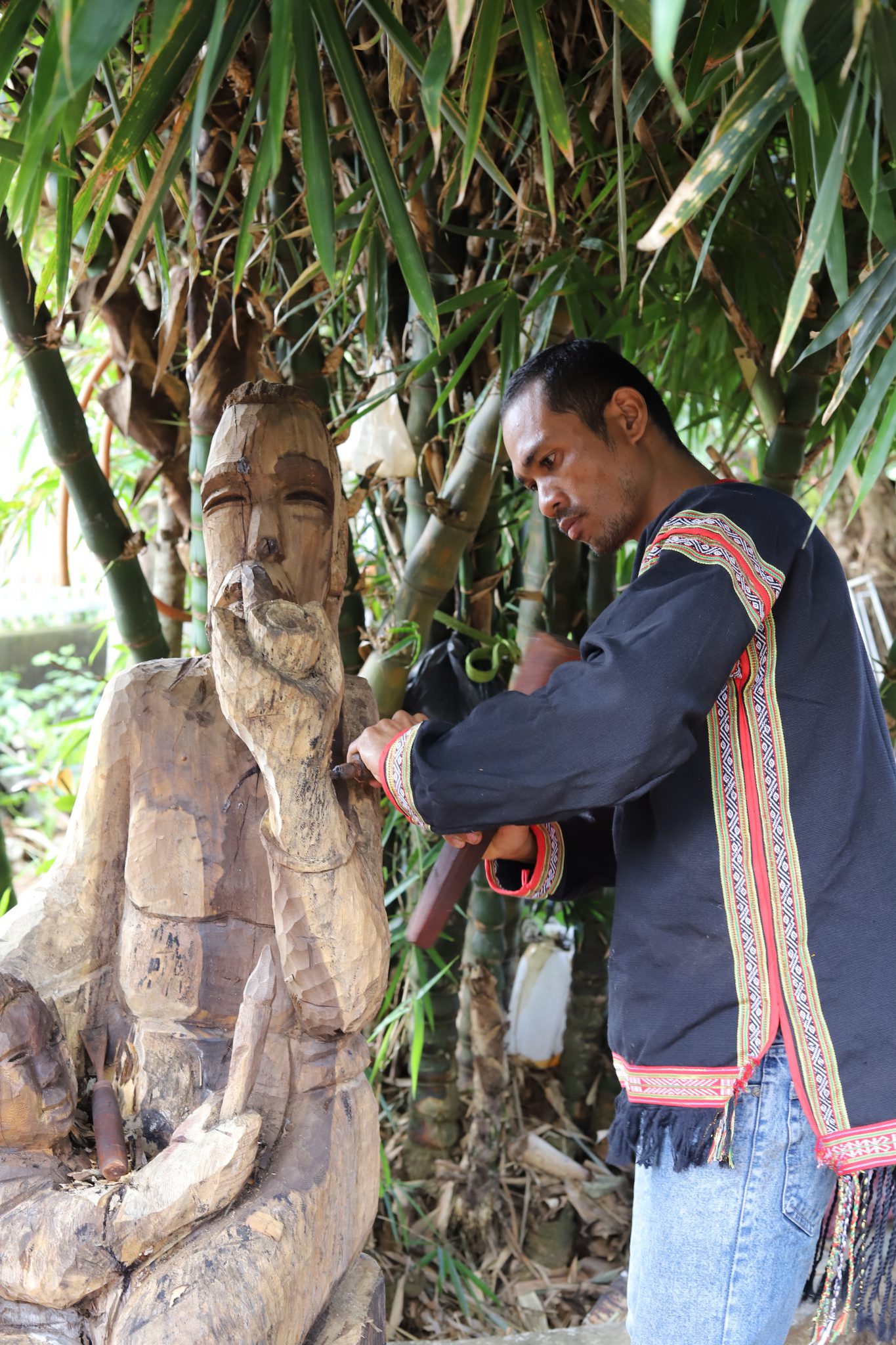 Nghệ nhân đẽo tượng gỗ tại Hợp tác xã dệt thổ cẩm Tơng Bông, Buôn Tơng Ju.
