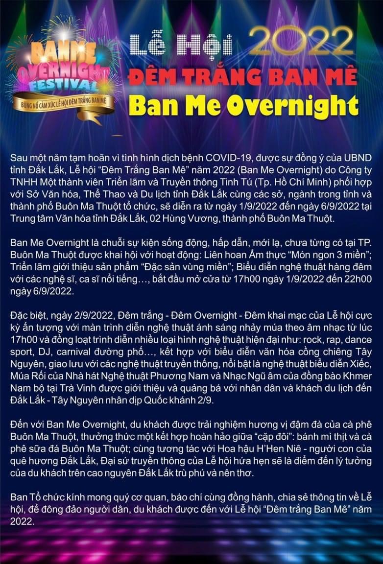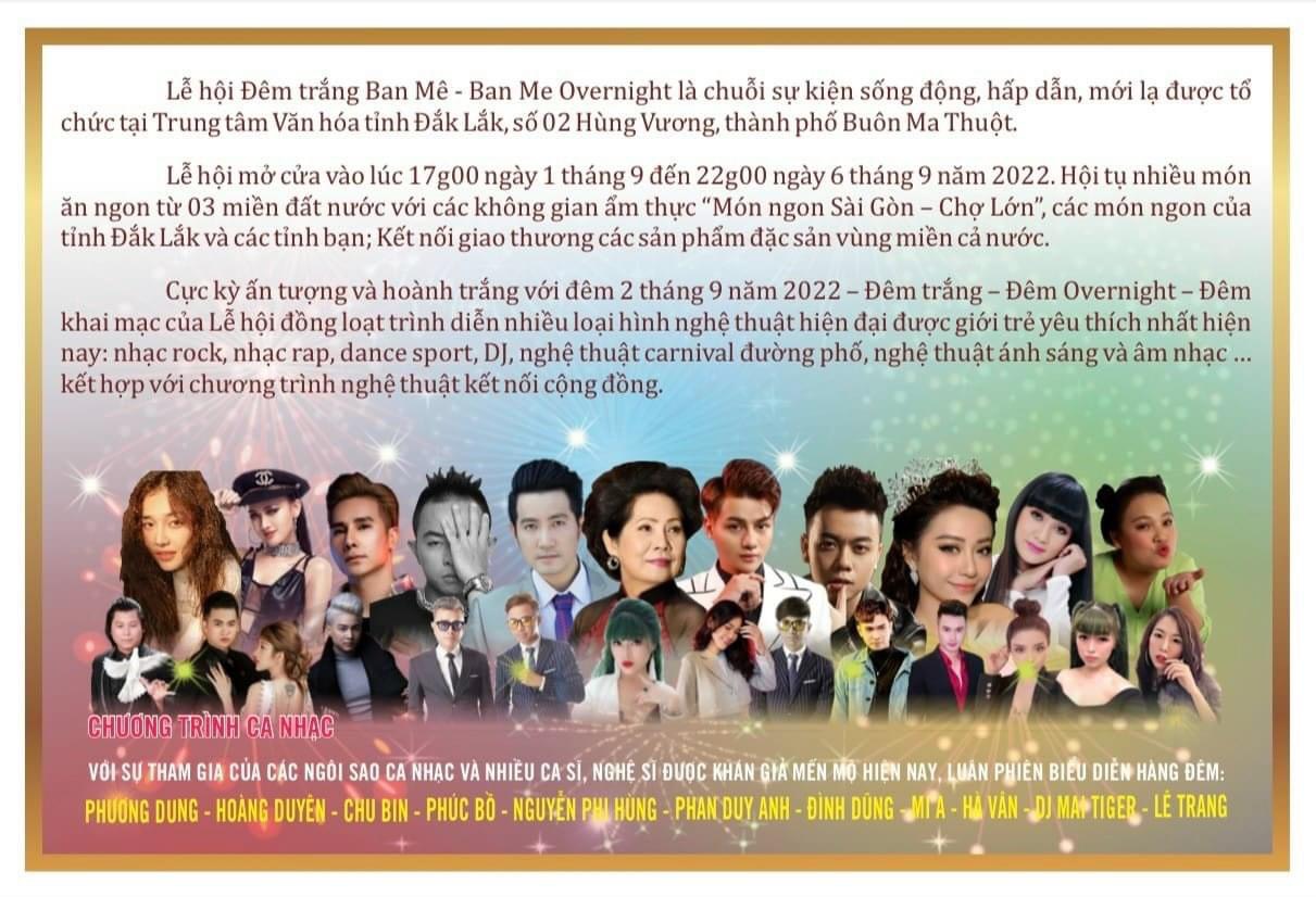 Lễ hội “Đêm trắng Ban Mê” năm 2022 (Ban Me Overnight) do Công ty TNHH MTV Triển lãm và Truyền thông Tinh Tú (Tp.Hồ Chí Minh) phối hợp Sở Văn hóa, Thể thao và Du lịch tỉnh Đắk Lắk cùng các sở, ban ngành trong tỉnh và thành phố Buôn Ma Thuột tổ chức, sẽ diễn ra từ ngày 01/9 - 6/9/2022 tại Trung tâm Văn hóa tỉnh Đắk Lắk, số 02 Hùng Vương, thành phố Buôn Ma Thuột.