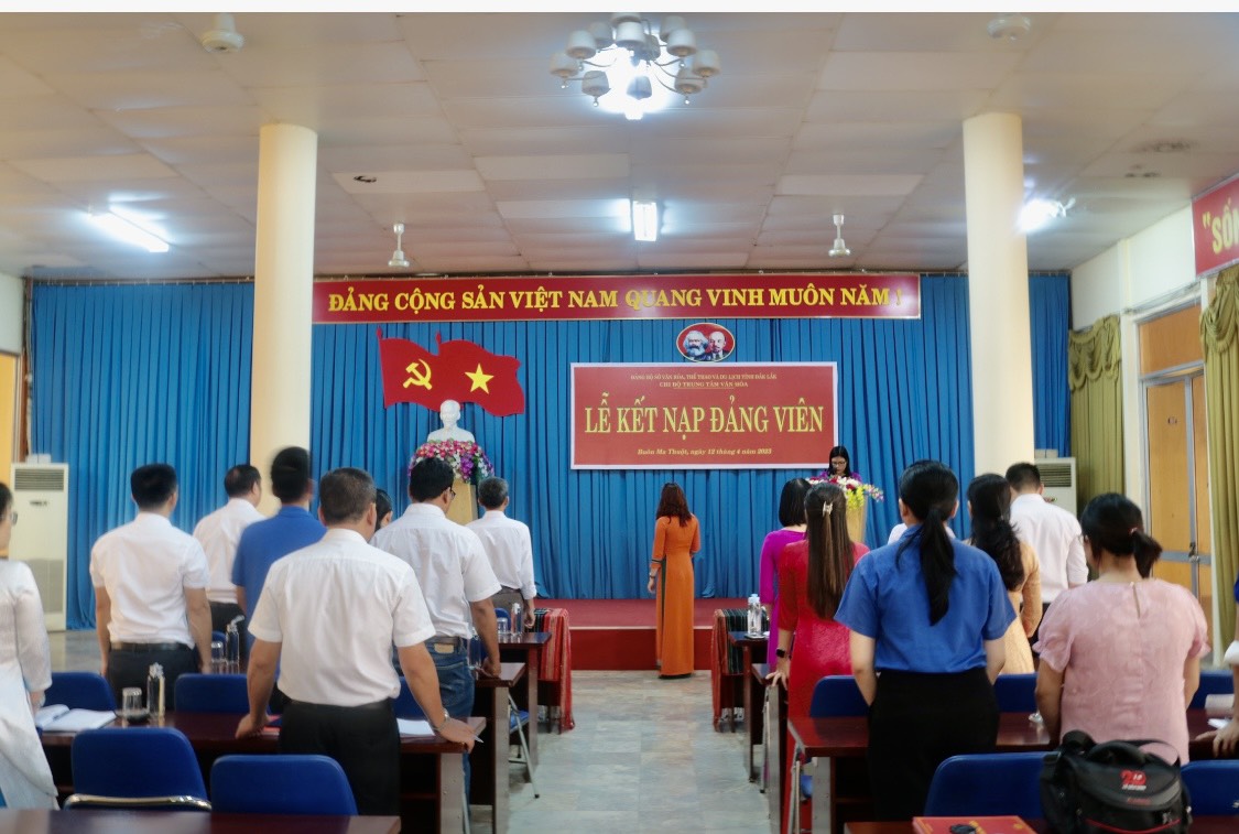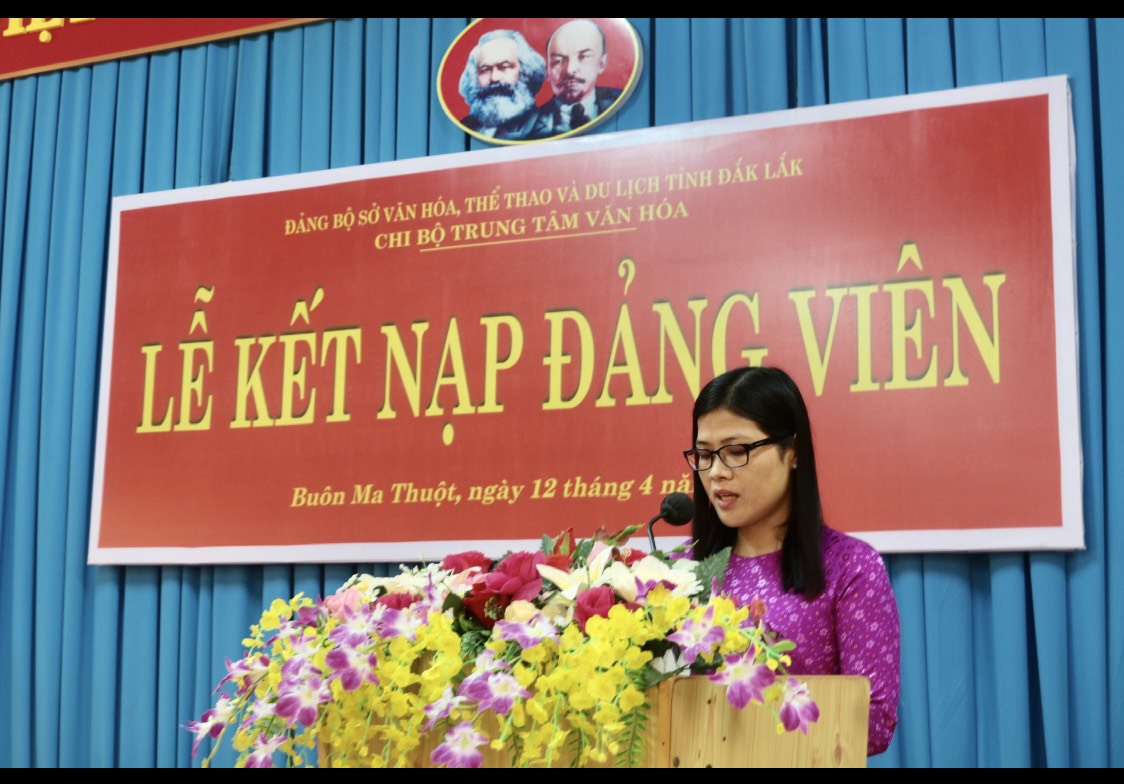 Được sự đồng ý của Đảng ủy Sở Văn hóa, Thể thao và Du lịch tỉnh Đắk Lắk, sáng ngày 12/4, tại Hội trường C, Chi bộ Trung tâm Văn hóa tỉnh đã trang trọng tổ chức Lễ kết nạp Đảng viên. Toàn bộ Đảng viên của Chi bộ và đại diện đoàn viên ưu tú thuộc Công đoàn bộ phận, Chi đoàn thanh niên đã đến dự buổi lễ.