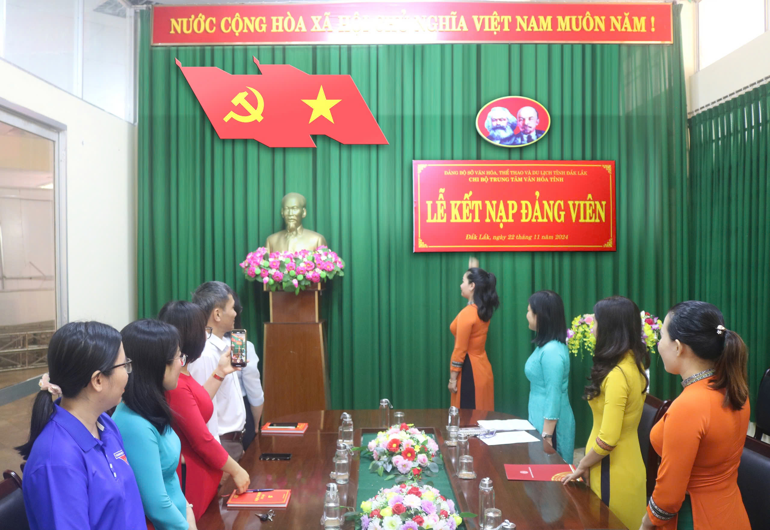Được sự đồng ý của Đảng ủy Sở Văn hóa, Thể thao và Du lịch tỉnh Đắk Lắk, sáng ngày 22/11, tại Phòng họp Trung tâm Văn hóa tỉnh, Chi bộ Trung tâm Văn hóa tỉnh đã trang trọng tổ chức Lễ Kết nạp Đảng viên. Toàn bộ Đảng viên trong Chi bộ, đại diện Đoàn viên ưu tú thuộc Công đoàn bộ phận, Chi đoàn thanh niên Trung tâm Văn hóa tỉnh đã đến dự buổi lễ.