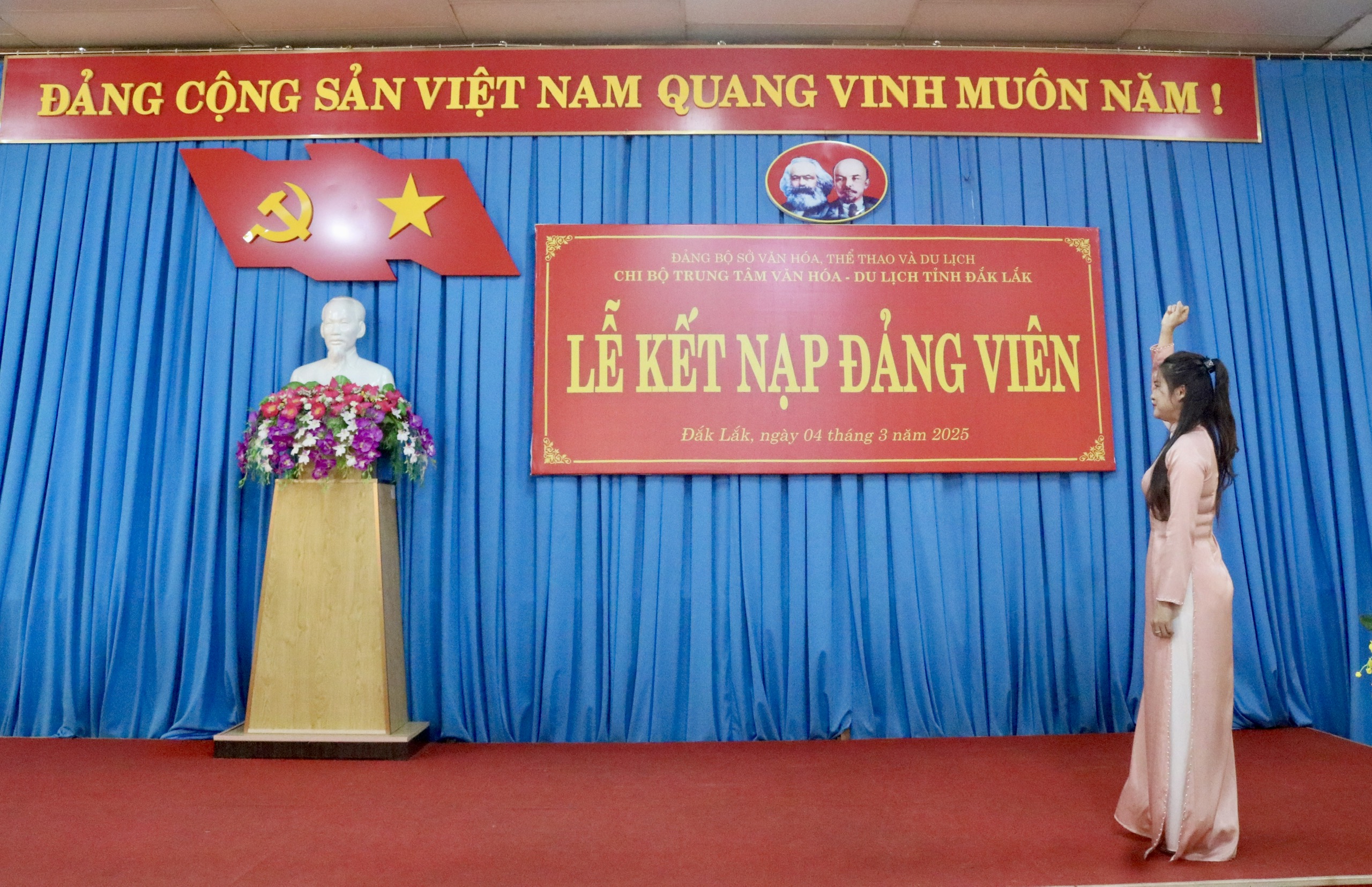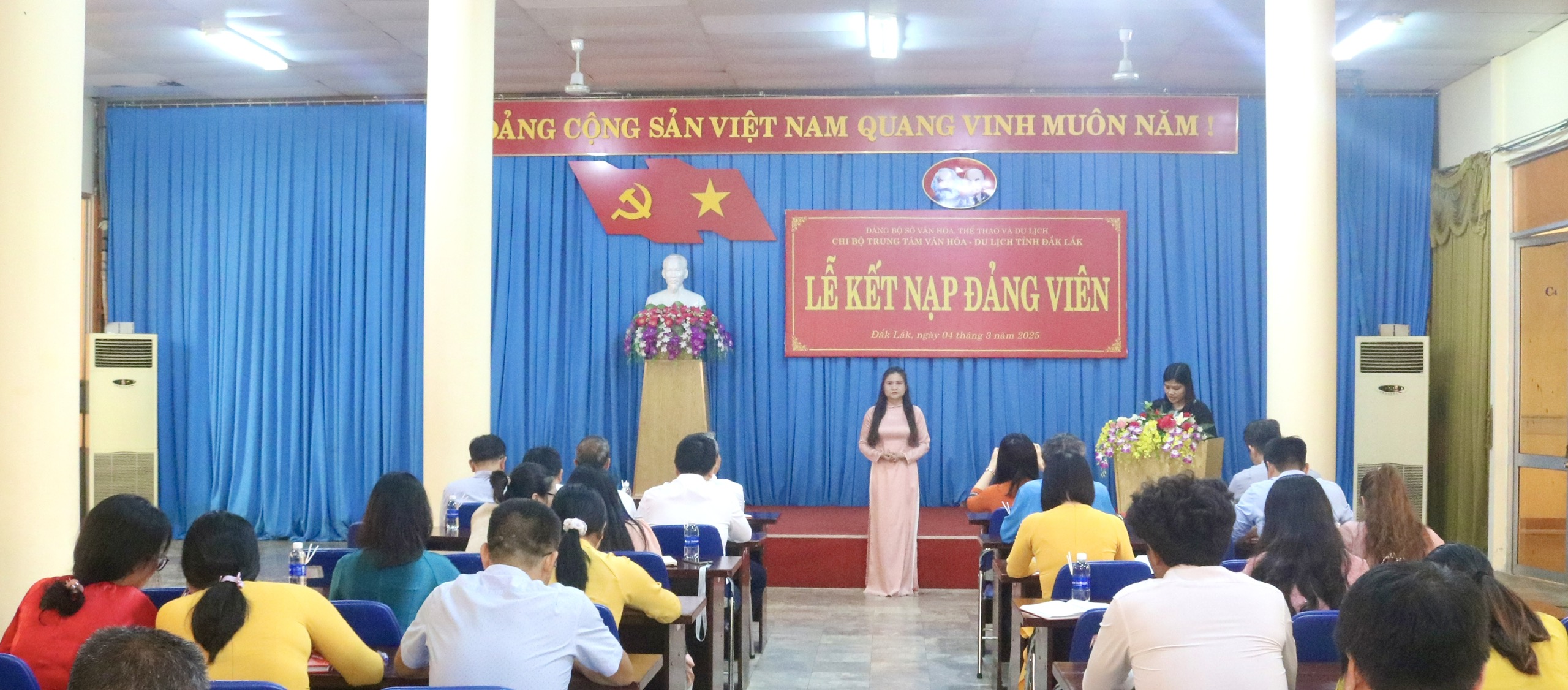 Được sự đồng ý của Đảng ủy Sở Văn hóa, Thể thao và Du lịch tỉnh Đắk Lắk, sáng ngày 04/3, tại Hội trường C, Trung tâm Văn hóa - Du lịch tỉnh, Chi bộ Trung tâm Văn hóa - Du lịch tỉnh đã trang trọng tổ chức Lễ Kết nạp Đảng viên. Toàn bộ Đảng viên của Chi bộ, đại diện đoàn viên ưu tú thuộc Công đoàn bộ phận, Chi đoàn thanh niên Trung tâm Văn hóa - Du lịch tỉnh đã dự buổi lễ.