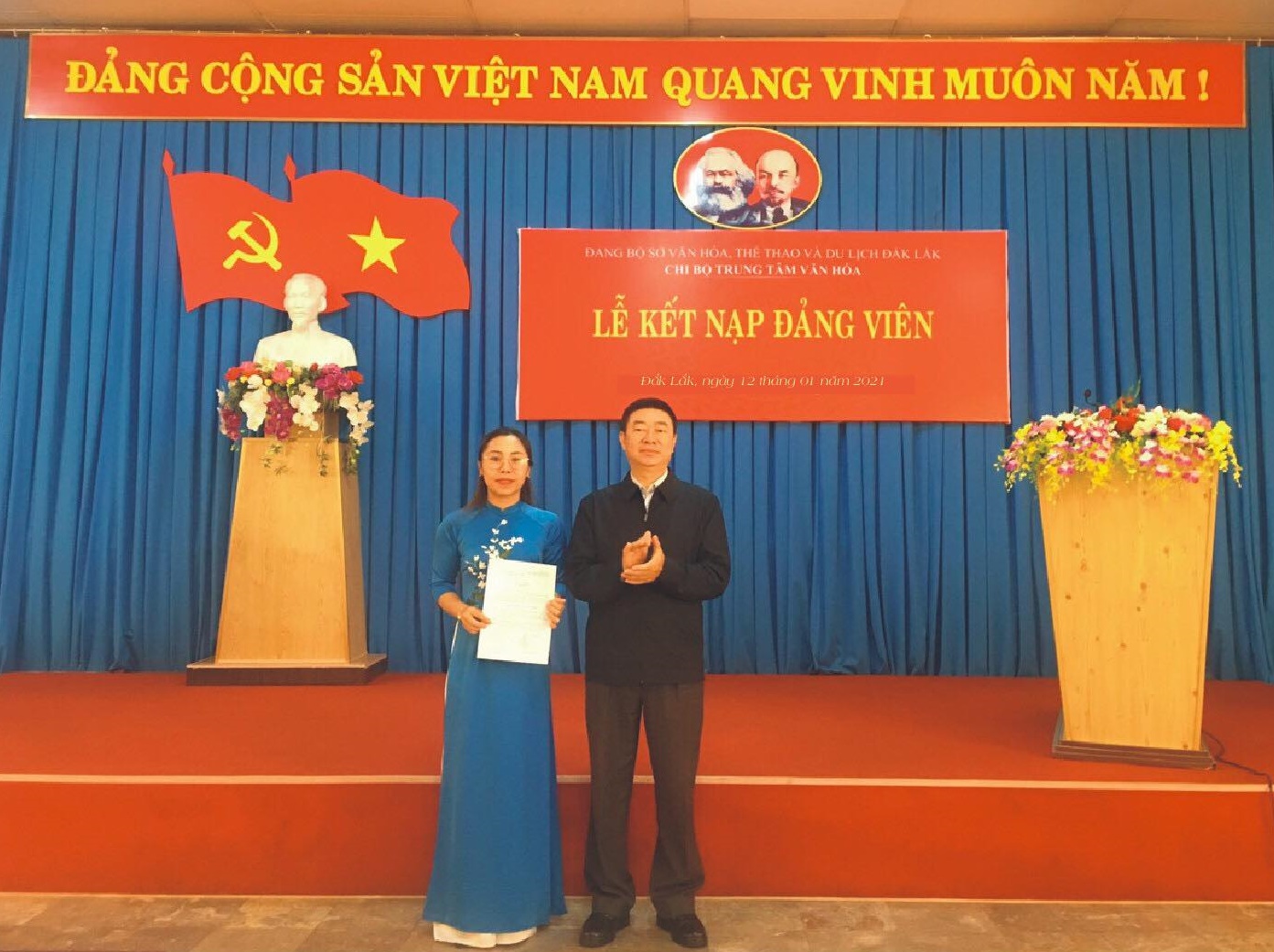 Buổi Lễ kết nạp Đảng viên mới của Chi bộ Trung tâm Văn hóa tỉnh kết thúc thành công tốt đẹp. Đảng viên mới cảm thấy tự hào và hứa quyết tâm phấn đấu để trở thành đảng viên chính thức dưới sự hướng dẫn của Chi bộ Trung tâm Văn hóa tỉnh.