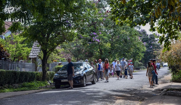 | Du khách tìm hiểu, khám phá buôn Akô Dhông, TP. Buôn Ma Thuột. Ảnh: Hữu Hùng |