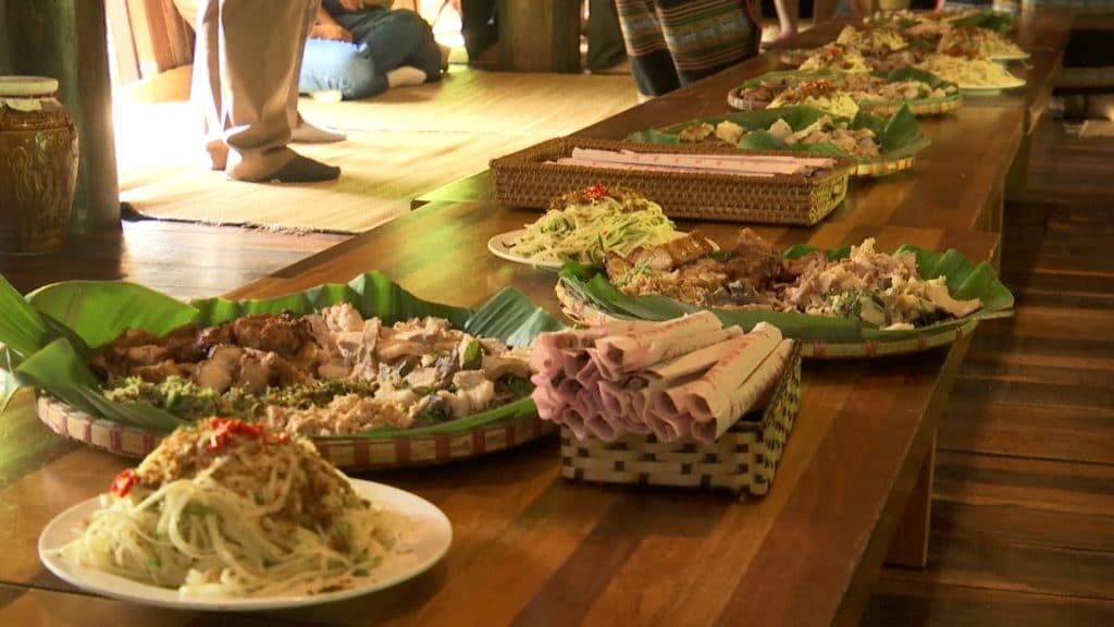 Bên cạnh việc được thưởng thức những chóe rượu cần ngon, các vị khách dự lễ còn được gia chủ đãi các món ăn truyền thống đậm vị cay, vị nồng của người Êđê. Trong không gian nhà dài, mọi người vừa ăn uống vừa kể cho nhau nghe những chuyện vui trong năm qua, tạo một không gian đặc biệt để những khách phương xa được trải nghiệm về văn hóa ẩm thực và sự hiếu khách của con người ở vùng đất đỏ cao nguyên..