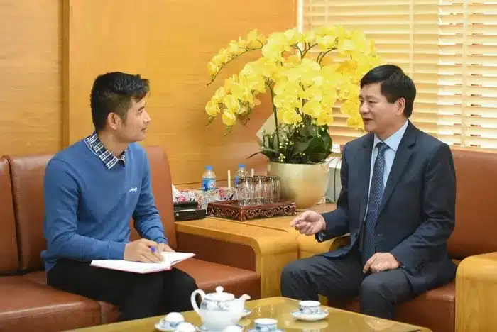 Phóng viên Nguyễn Trung Kiên phỏng vấn ông Lê Thành Đô, Chủ tịch UBND tỉnh Điện Biên. (Ảnh: Xuân Tư/TTXVN)