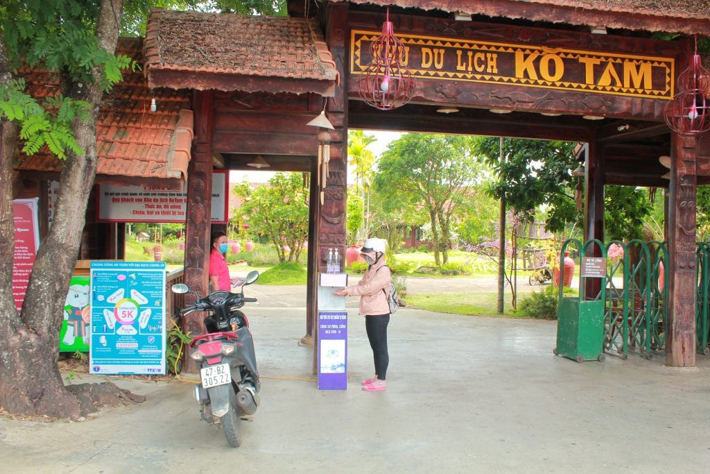 | Khu du lịch sinh thái - văn hóa cộng đồng Kô Tam thực hiện kiểm tra thân nhiệt, rửa tay sát khuẩn đối với khách đến tham quan. |