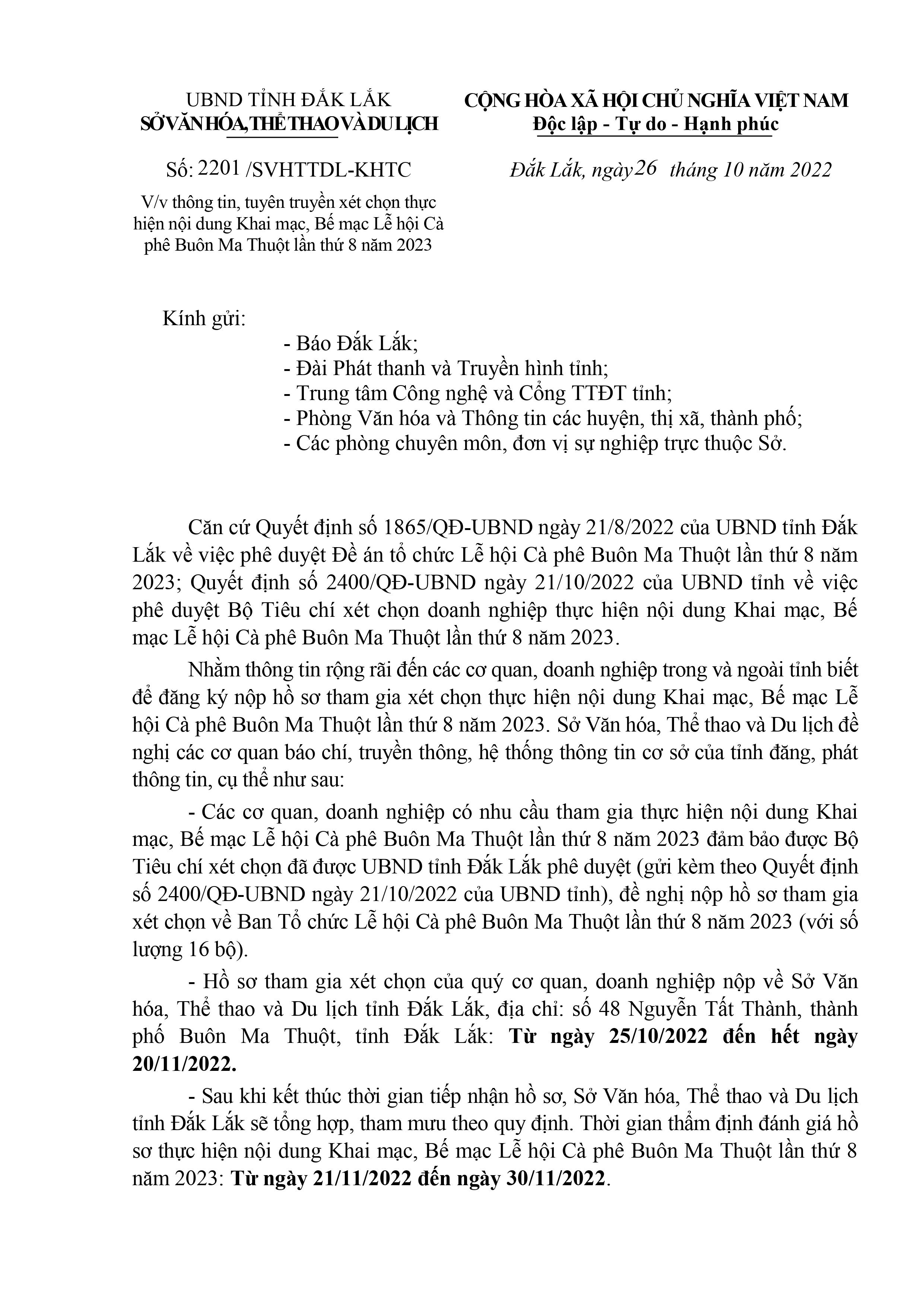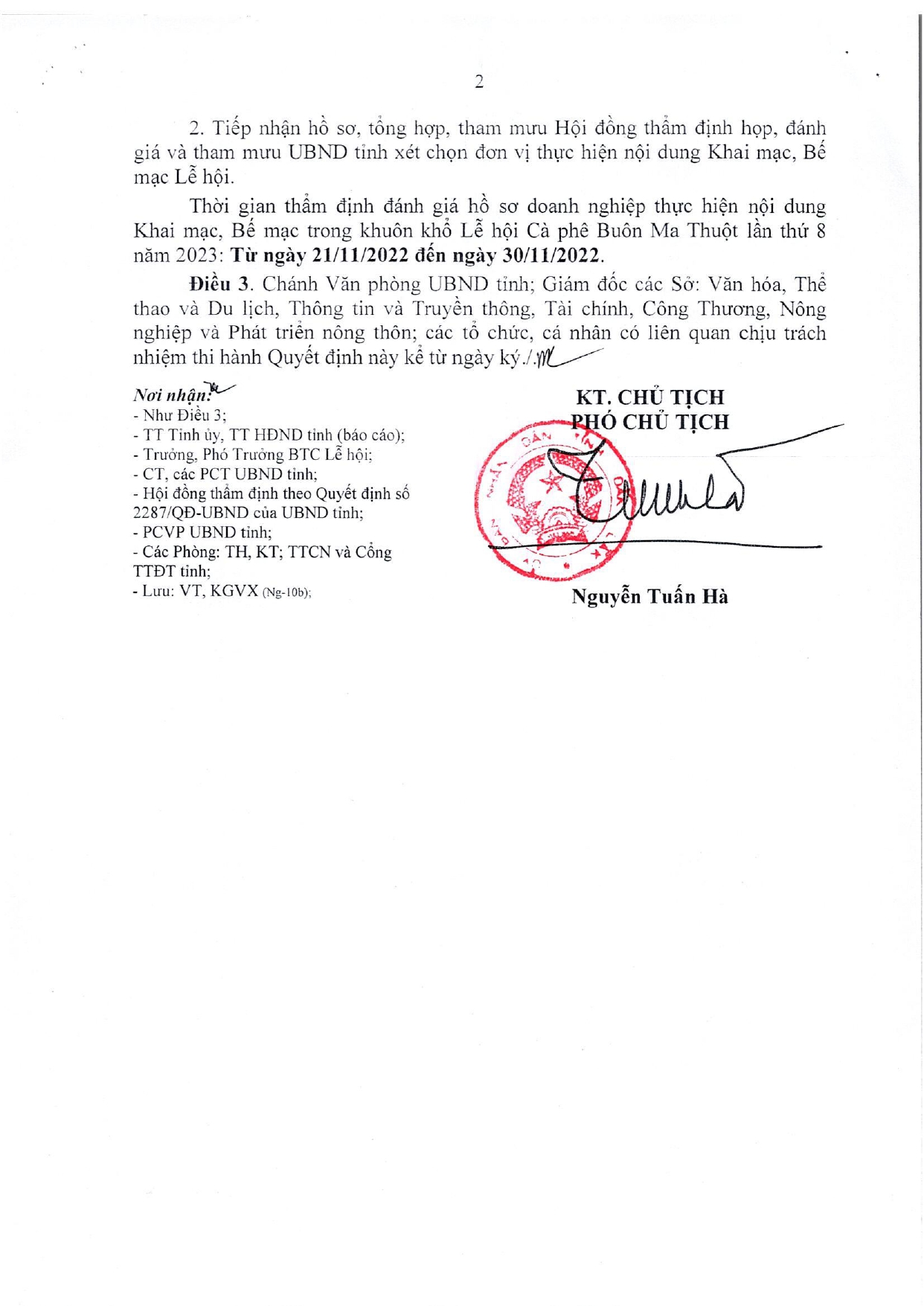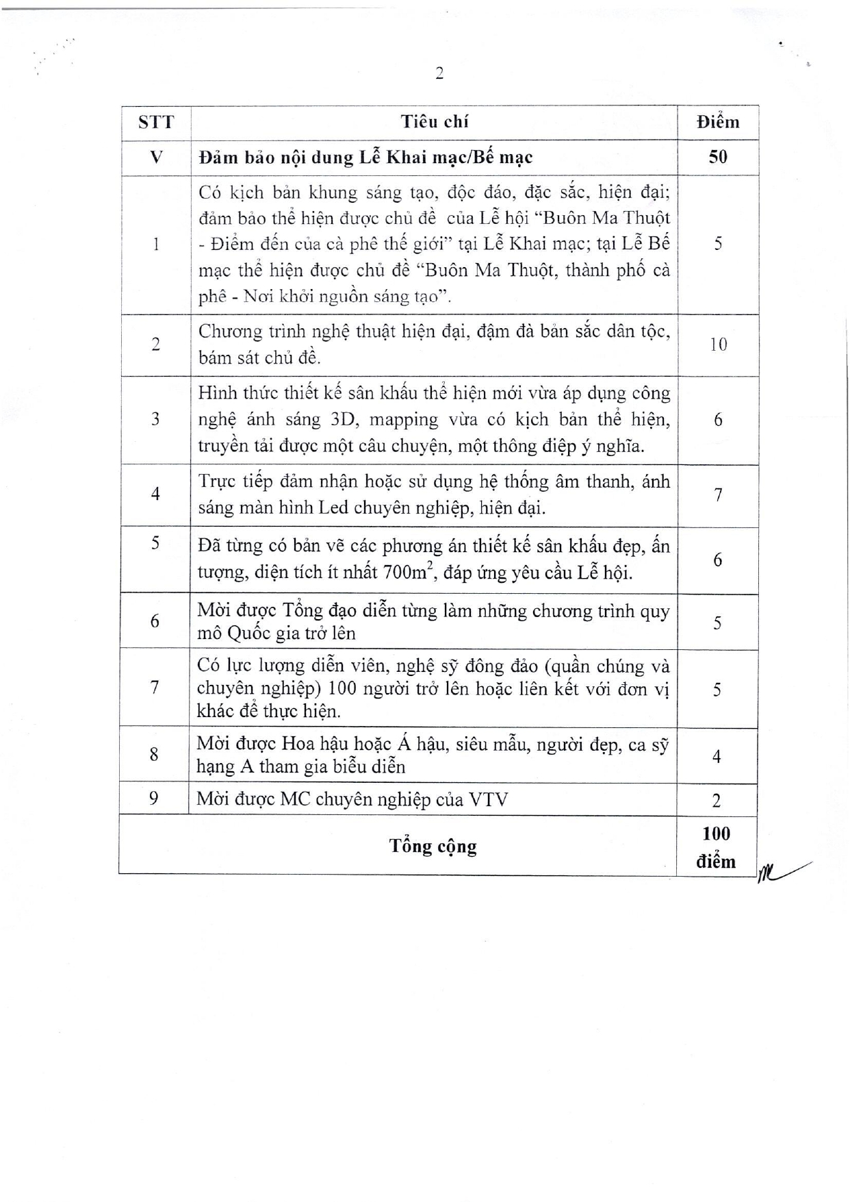 Quyết định về việc phê duyệt Bộ Tiêu chí xét chọn doanh nghiệp thực hiện nội dung Khai mạc, Bế mạc Lễ hội Cà phê Buôn Ma Thuột lần thứ 8 năm 2023.