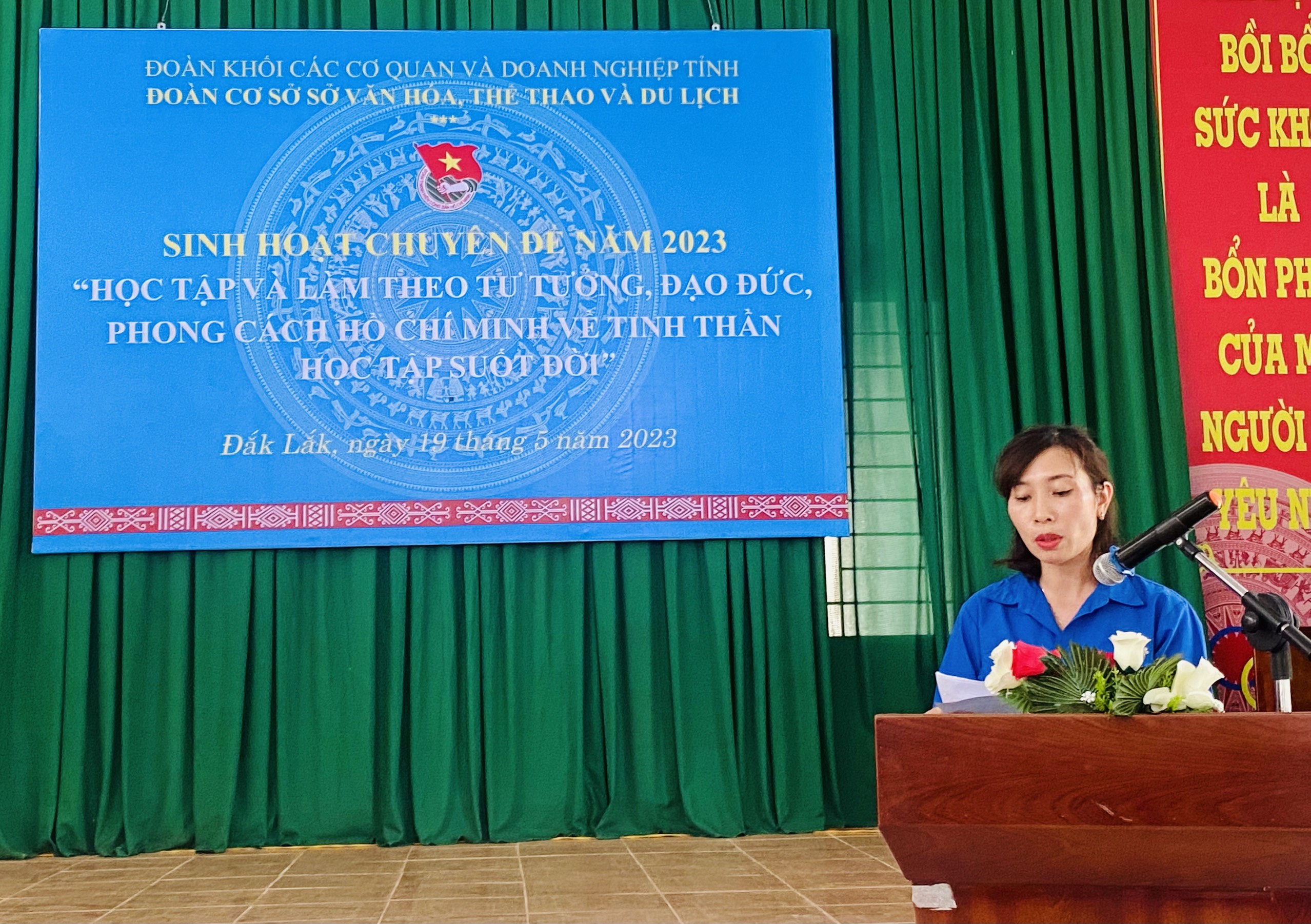 Đoàn viên Chi đoàn Trung tâm Văn hóa tỉnh cùng các Chi đoàn trực thuộc đã tham gia những hoạt động như: Dâng hương tại Nhà tưởng niệm Bác Hồ thuộc Nhà đày Buôn Ma Thuột; xem phim tài liệu về Chủ tịch Hồ Chí Minh; học tập chuyên đề “Học tập và làm theo tư tưởng đạo đức, phong cách Hồ Chí Minh năm 2023”.