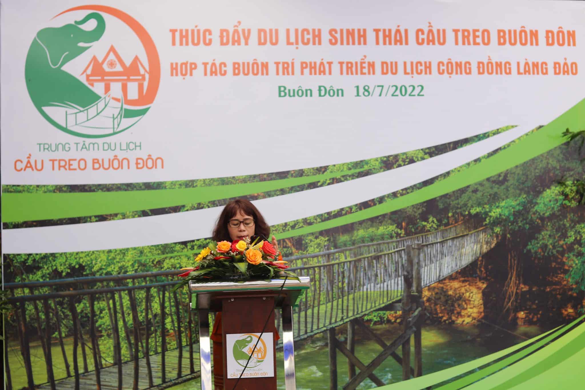 Bà Trần Thị Kim Ánh - Giám đốc Chi nhánh giới thiệu về Bộ nhận diện thương hiệu mới của Trung tâm Du lịch Cầu treo Buôn Đôn.