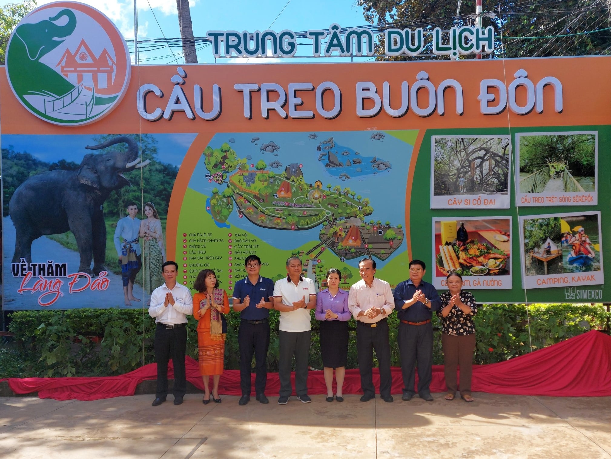Các đại biểu kéo băng ra mắt bảng thông tin của Trung tâm du lịch Cầu treo Buôn Đôn.