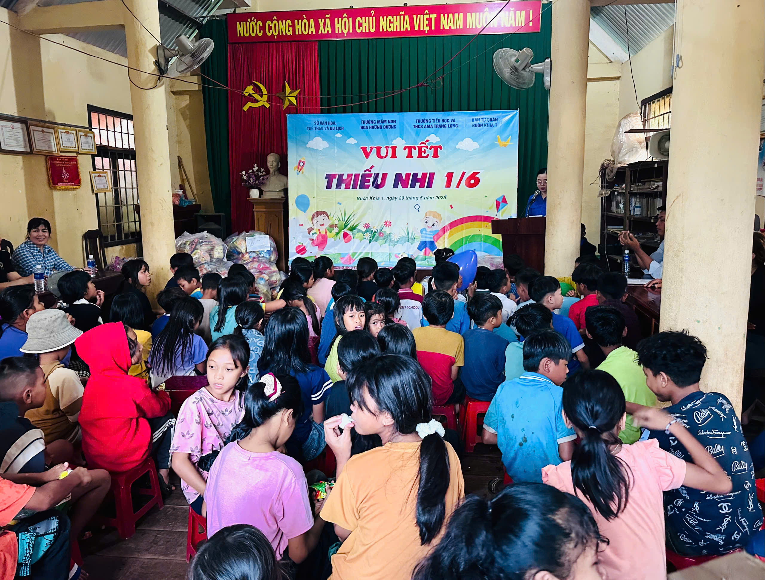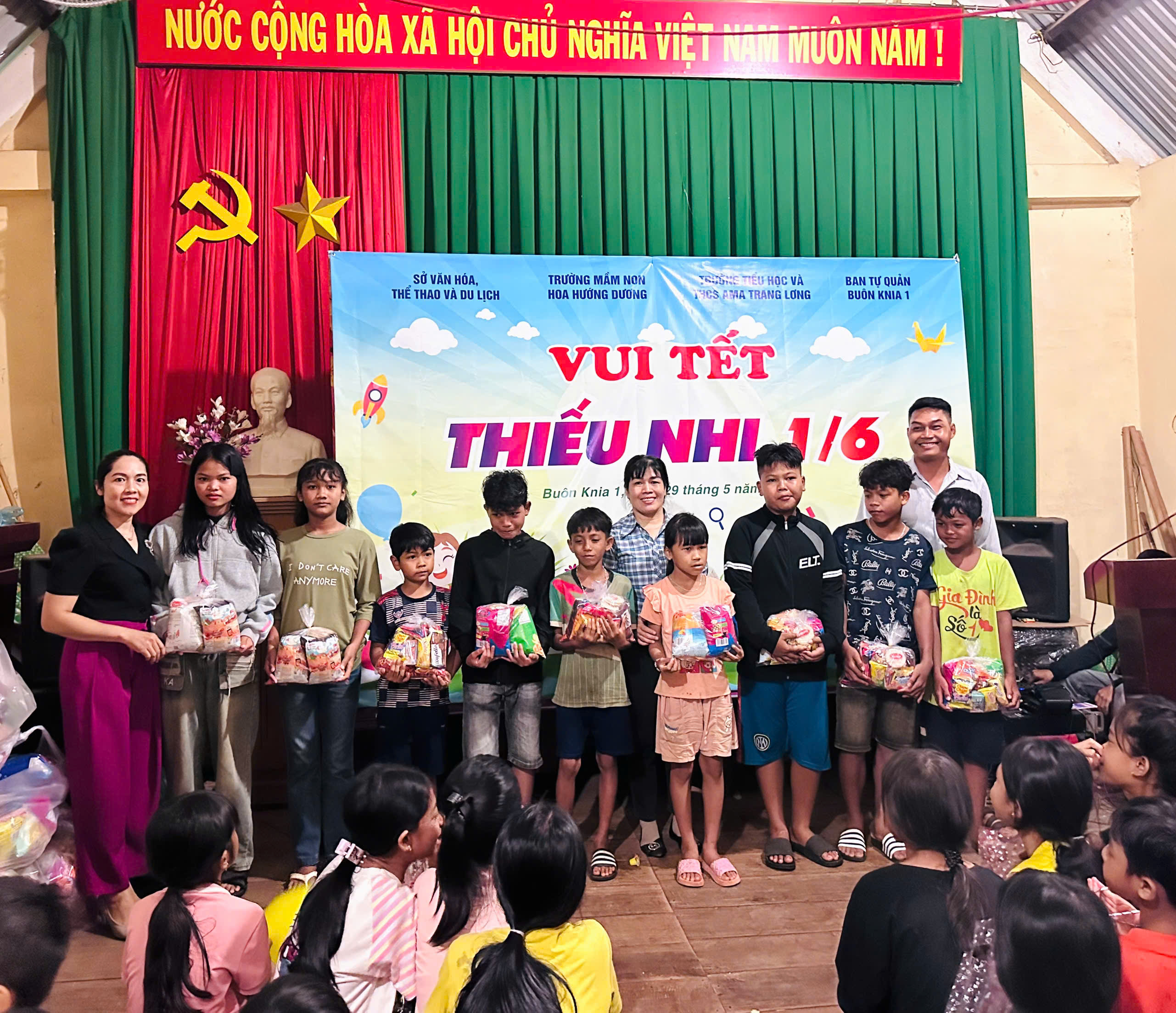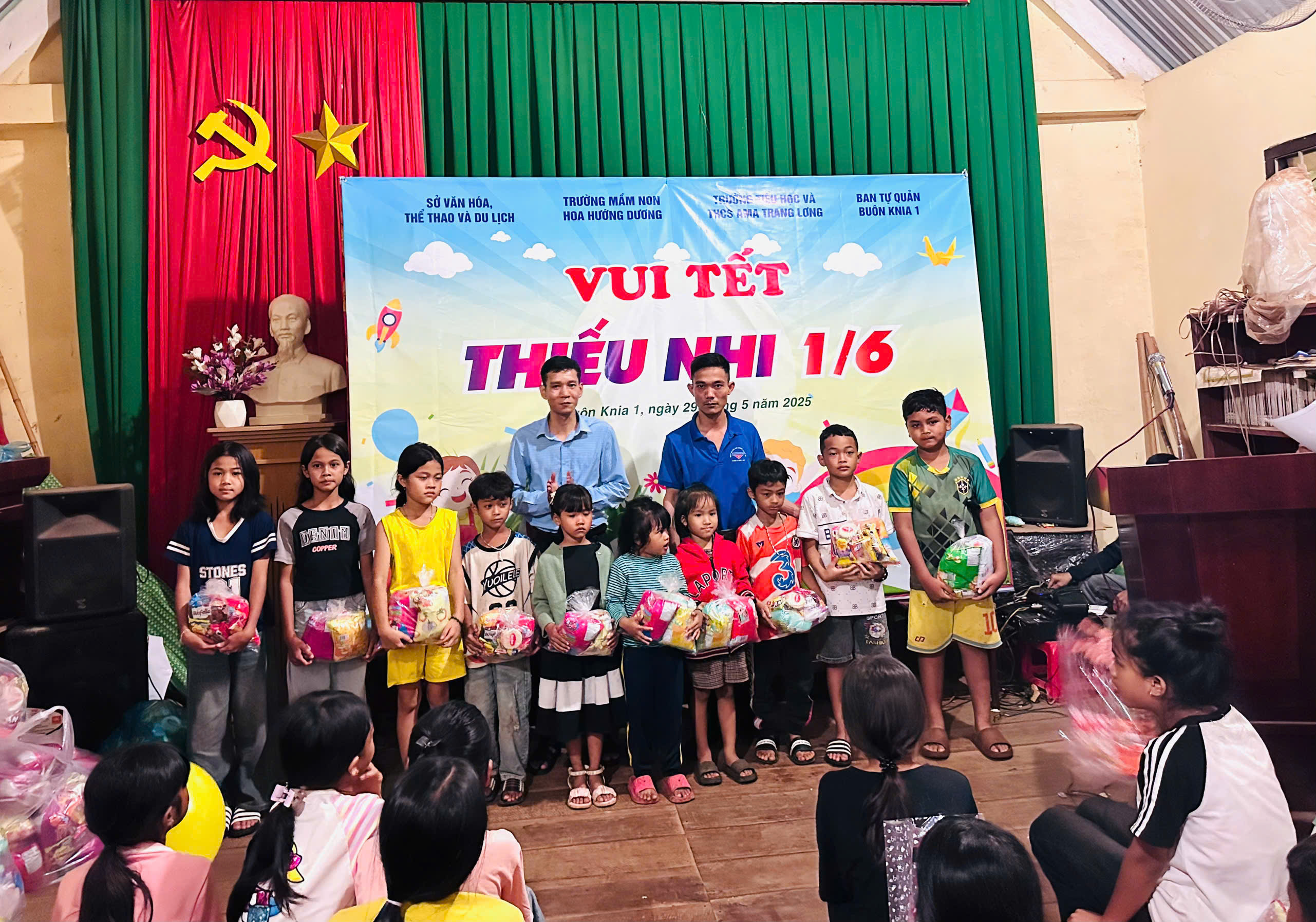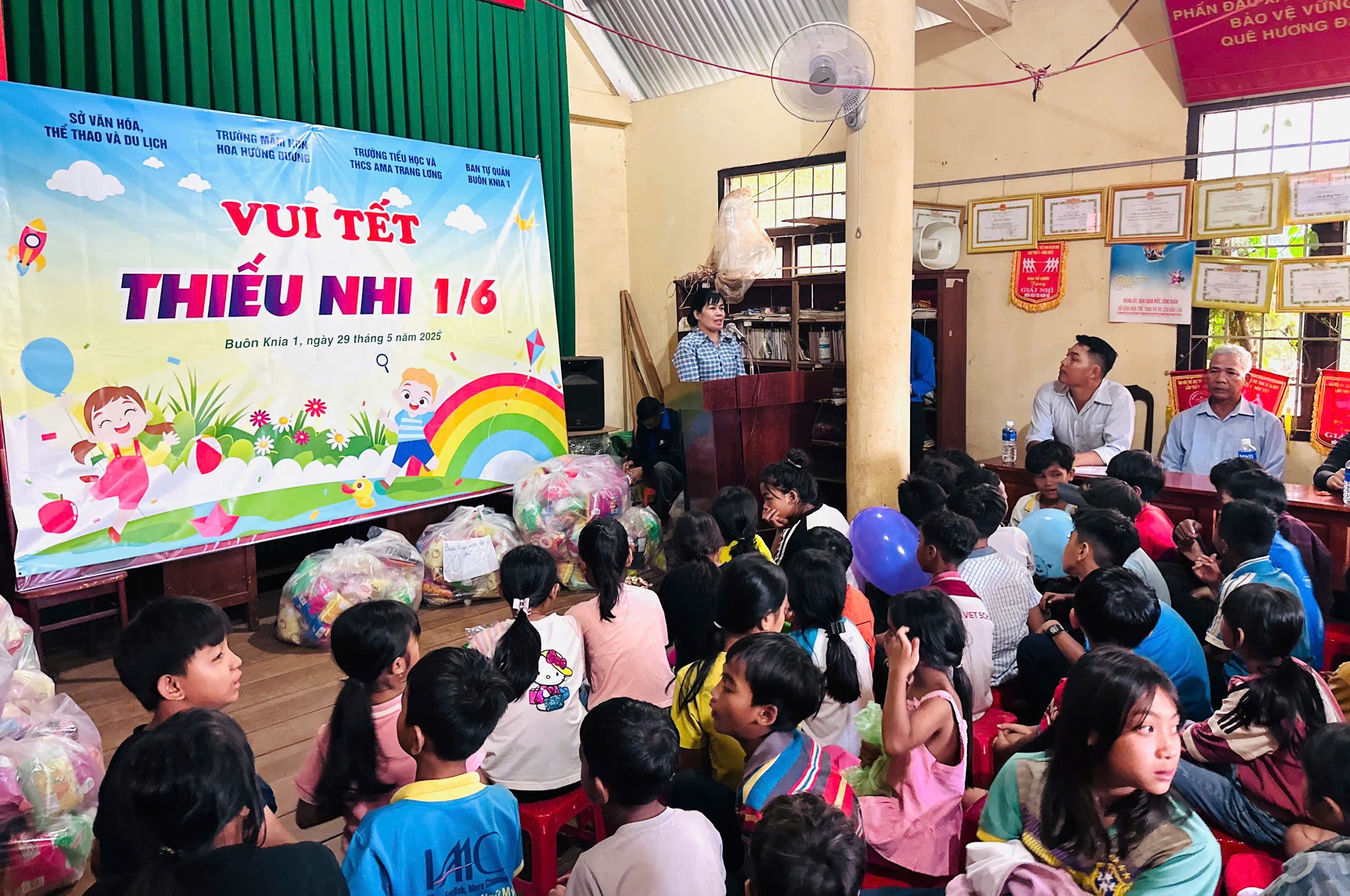 Nhân dịp Quốc tế thiếu nhi 1/6, trong 02 ngày (29/5 và 30/5/2025), Sở Văn hóa, Thể thao và Du lịch phối hợp Trường Mầm non Hoa Hướng Dương, Trường Tiểu học và THCS Ama Trang Lơng, Ngân hàng Nhà nước chi nhánh khu vực 11, Công ty CP Bệnh viện đa khoa Hòa Bình, Trường THCS Tô Vĩnh Diện tổ chức hoạt động vui Tết thiếu nhi 1/6 cho các em thiếu nhi tại buôn Knia 1, xã Ea Bar, huyện Buôn Đôn và buôn Tung Krắk, xã Ea Drông, thị xã Buôn Hồ.