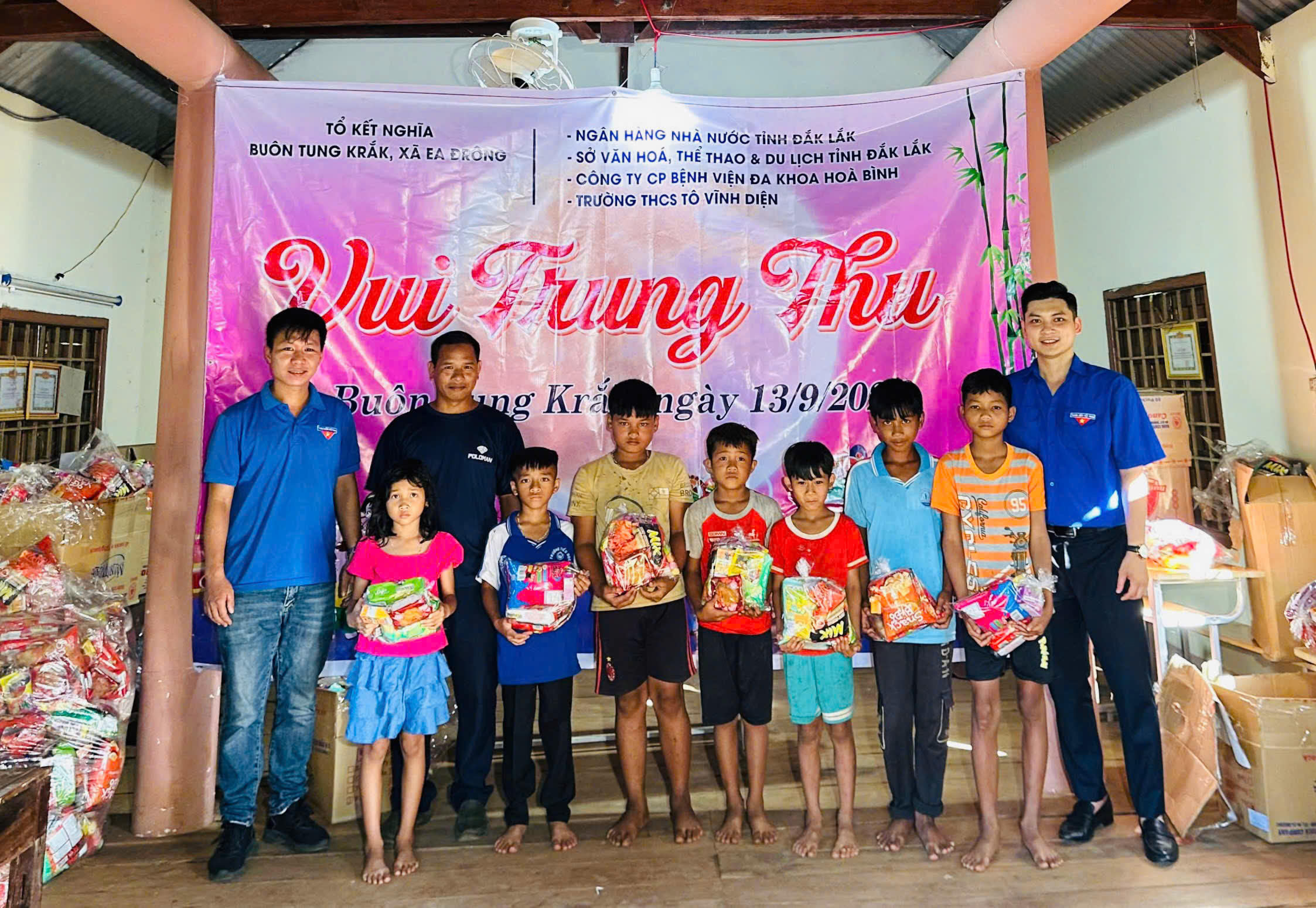 Nhân dịp tết Trung thu, chiều ngày 13/9/2024 (nhằm ngày 11/8 âm lịch), Sở Văn hóa, Thể thao và Du lịch phối hợp Ngân hàng Nhà nước tỉnh Đắk Lắk, Công ty CP Bệnh viện đa khoa Hòa Bình, Trường THCS Tô Vĩnh Diện và Tổ kết nghĩa buôn Tung Đrắk, xã Ea Drông, thị xã Buôn Hồ tổ chức hoạt động vui tết Trung thu cho các em thiếu nhi tại địa phương.