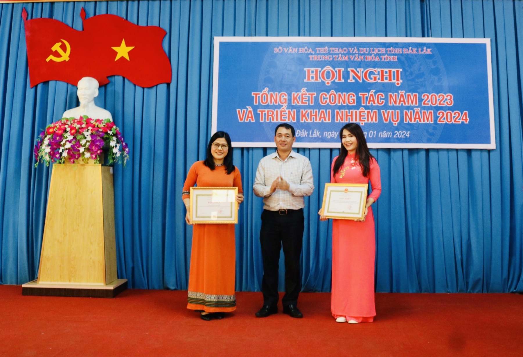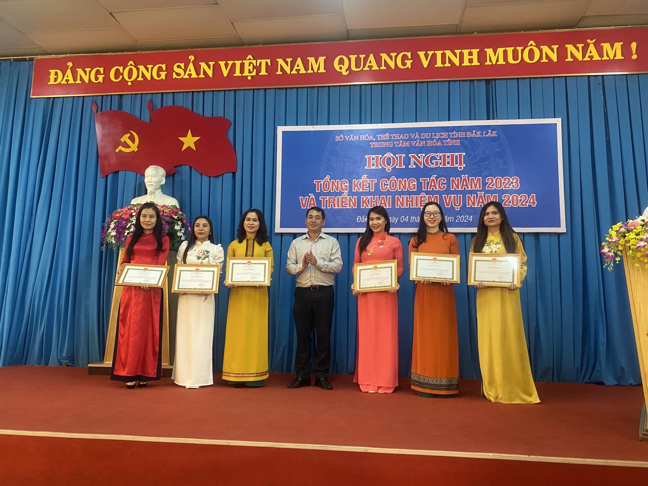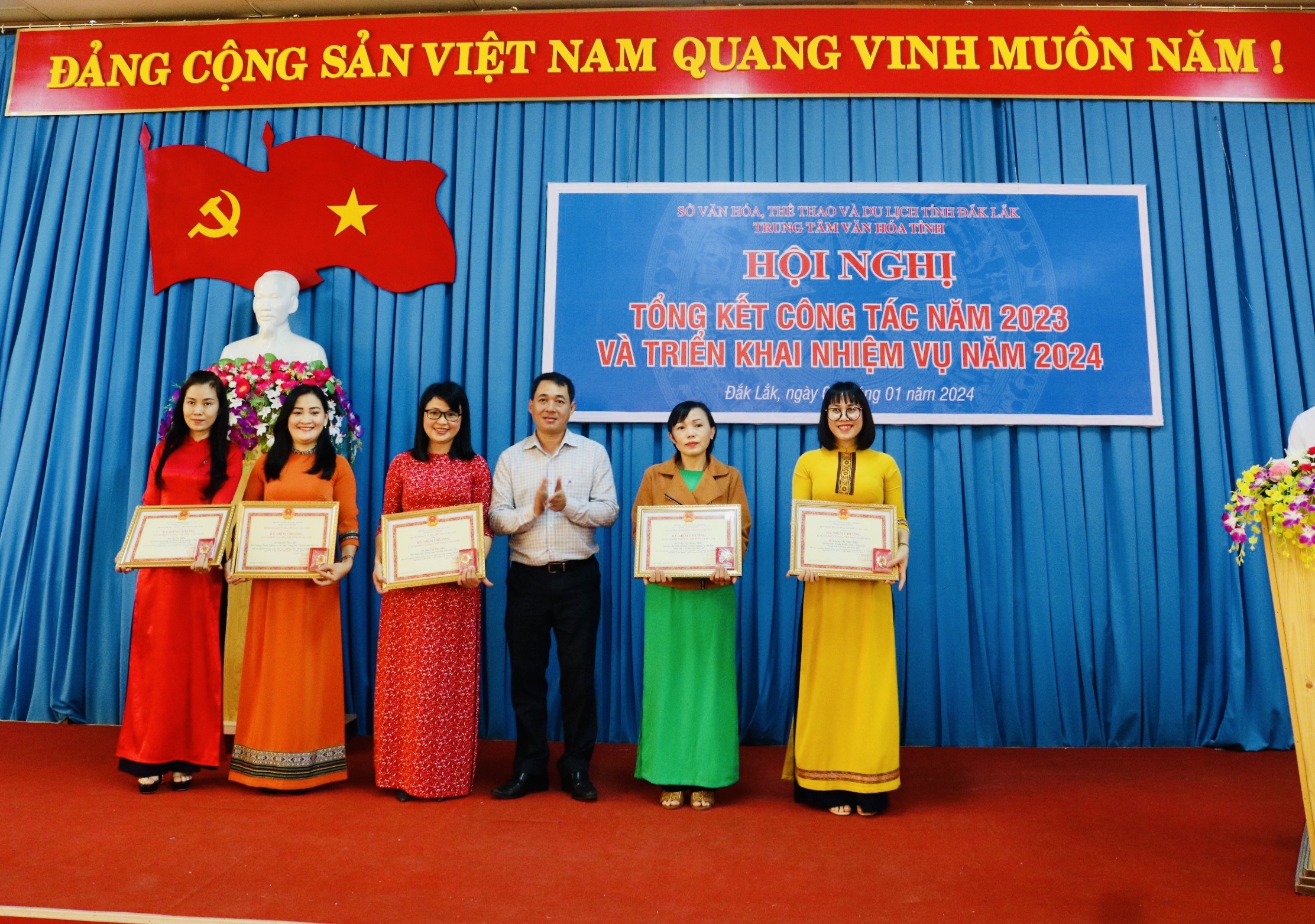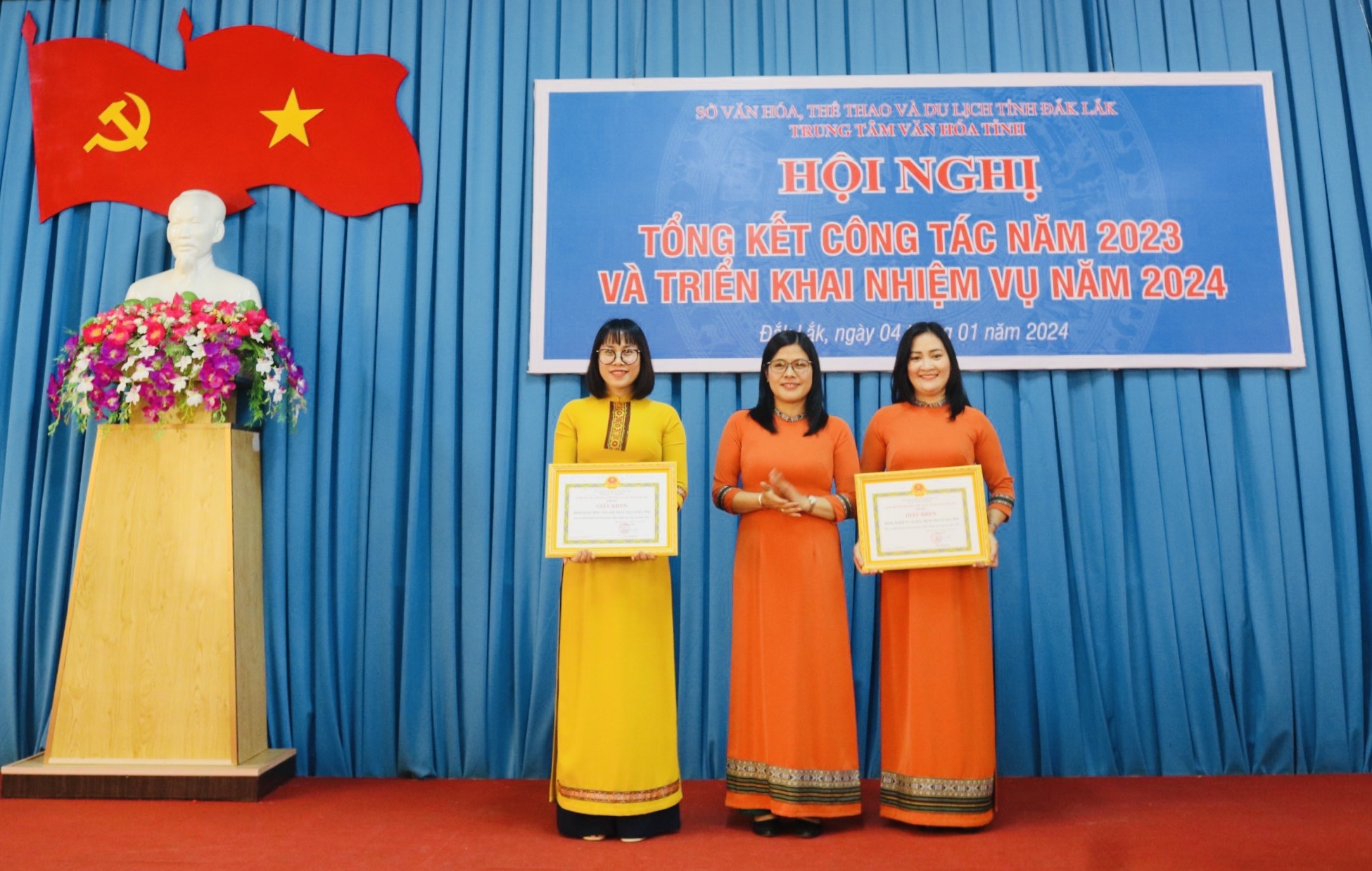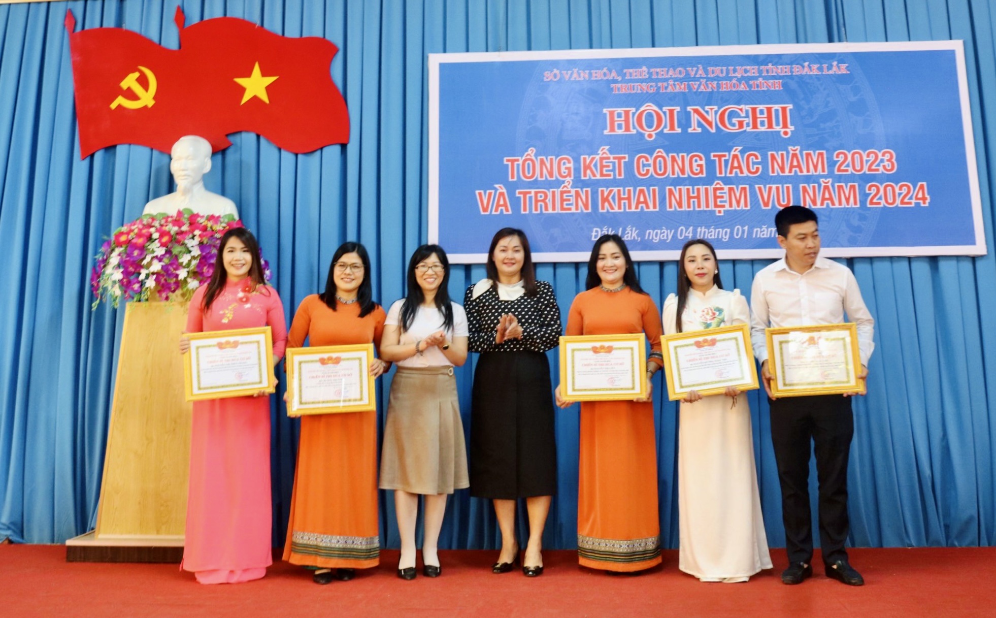 Nhân dịp này, có 05 cá nhân được tặng Kỷ niệm chương “Vì Sự nghiệp Văn hóa, Thể thao và Du lịch”; 02 tập thể được tặng Bằng khen của UBND tỉnh Đắk Lắk có thành tích xuất sắc tham gia Hội thi tuyên truyền lưu động tại Thành phố Hải Phòng; 06 cá nhân được tặng Bằng khen của UBND tỉnh Đắk Lắk có thành tích xuất sắc trong tham gia Hội thi Dân vận khéo tỉnh Đắk Lắk năm 2023; 05 cá nhân được tặng danh hiệu “Chiến sĩ thi đua cơ sở” vì có thành tích xuất sắc, tiêu biểu trong phong trào thi đua năm 2023; 02 tập thể và 12 cá nhân được tặng Giấy khen Giám đốc Sở VHTTDL đạt thành tích xuất sắc trong thực hiện nhiệm vụ công tác năm 2023./.