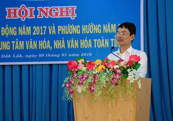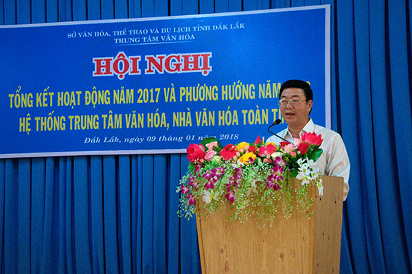 Ngày 09/01/2018, Trung tâm Văn hóa tỉnh tổ chức Hội nghị Tổng kết hoạt động hệ thống Trung tâm Văn hóa, Nhà Văn hóa toàn tỉnh năm 2017 và đề ra phương hướng năm 2018. Ông Đặng Gia Duẩn, Phó Giám đốc Sở Văn hóa, Thể thao và Du lịch dự và chỉ đạo Hội nghị; tham dự hội nghị còn có đại diện lãnh đạo các Phòng Văn hóa – Thông tin, Trung tâm Văn hóa, Nhà Văn hóa các huyện, thị xã, thành phố, Bộ CHQS tỉnh, Lữ đoàn Đặc công 198, Trại Giam Đắk Tân cùng toàn thể công chức, viên chức, người lao động Trung tâm Văn hóa tỉnh.