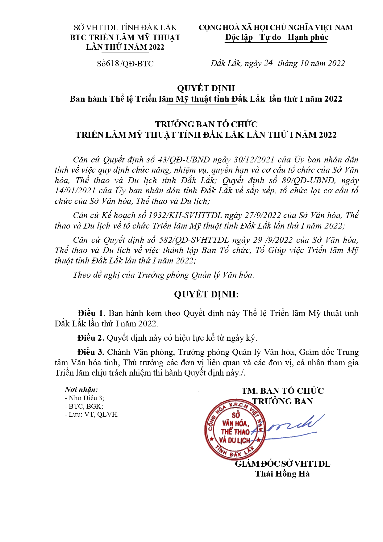 Nhằm phát huy tinh thần sáng tạo của đội ngũ họa sĩ, hội viên, cộng tác viên mỹ thuật và tạo điều kiện cho hoạt động mỹ thuật phát triển, Sở Văn hóa, Thể thao và Du lịch tổ chức Triển lãm Mỹ thuật tỉnh Đắk Lắk lần thứ I năm 2022.